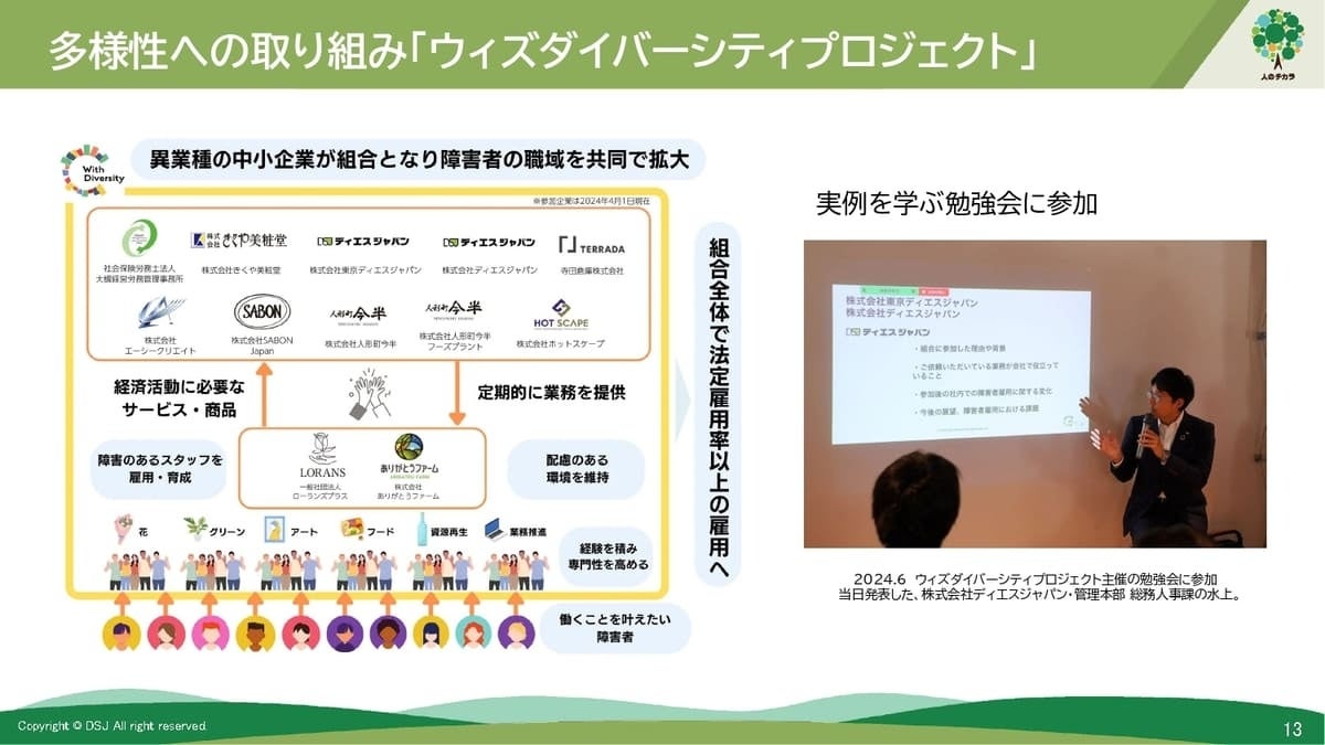 そこで当社は「ウィズダイバーシティプロジェクト」という中小企業の組合に参画し、共同雇用という形で障がい者雇用を推進することにしました。ウィズダイバーシティには現在60以上の発注できるサービスがあるのですが、自社リソースではそれまでなかなかできなかった業務を、ウィズダイバーシティに参加している障害者福祉事業所に発注することができ、経営としてもプラスになっています。