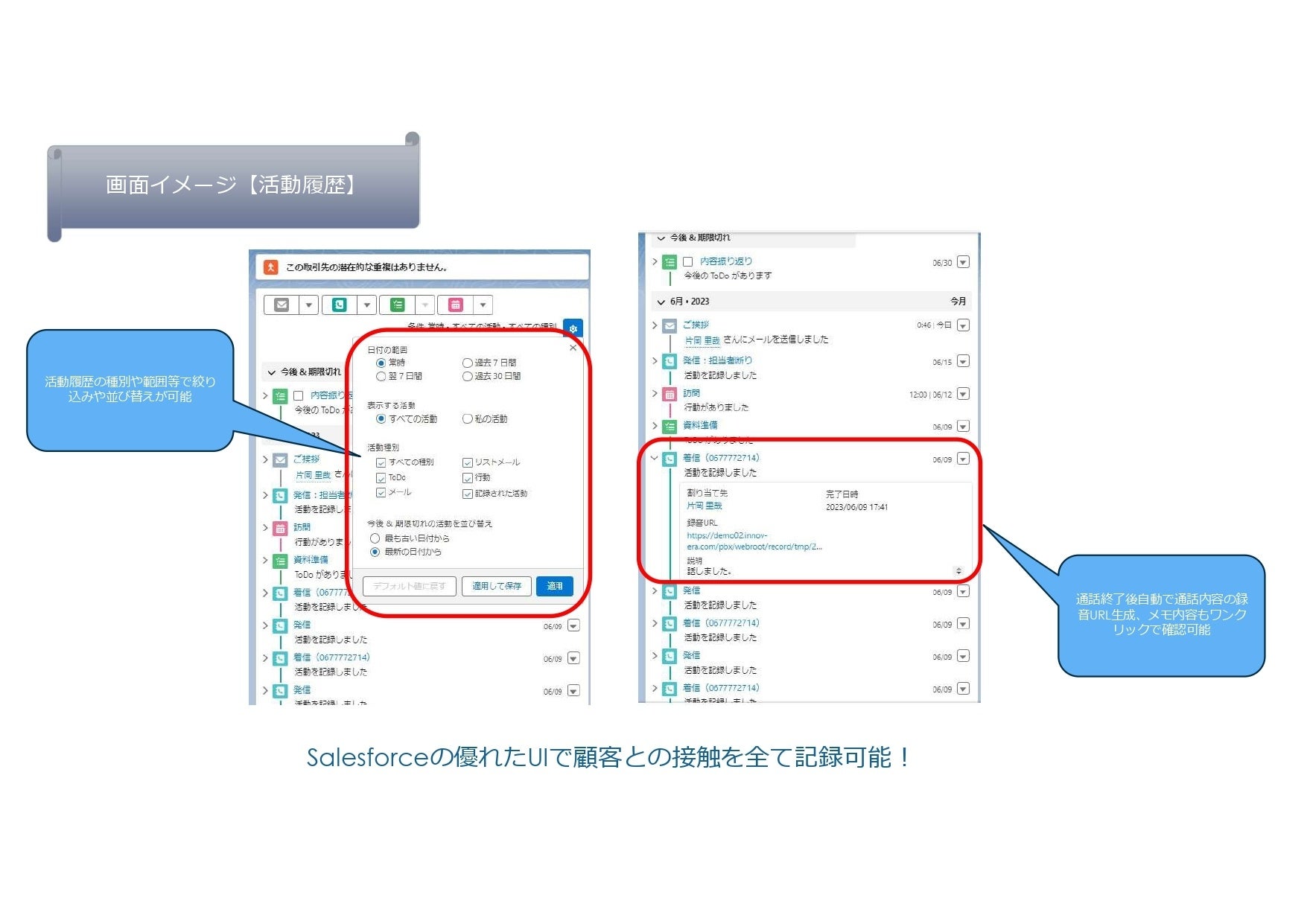 顧客への活動履歴にINNOVERAでの発着信履歴が表示されますので、電話業務を活動履歴として記録することができます。顧客への通話も一つの活動として管理することができます。