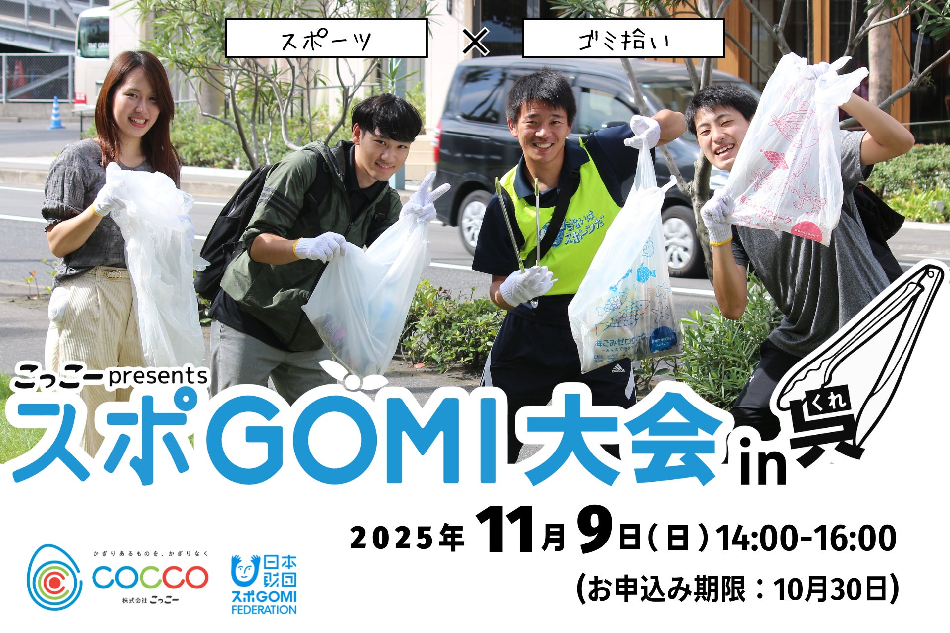 2025年11月9日(日)14:00より、JR呉駅近辺にて、スポーツと社会貢献を融合させた新感覚イベント「スポGOMI大会 in 呉」を開催いたします。本イベントは、株式会社こっこーが主催し、一般財団法人 日本財団スポGOMI連盟の運営協力のもと、呉市、呉市教育委員会、中国新聞社、中国放送の後援を受けて実施されます。