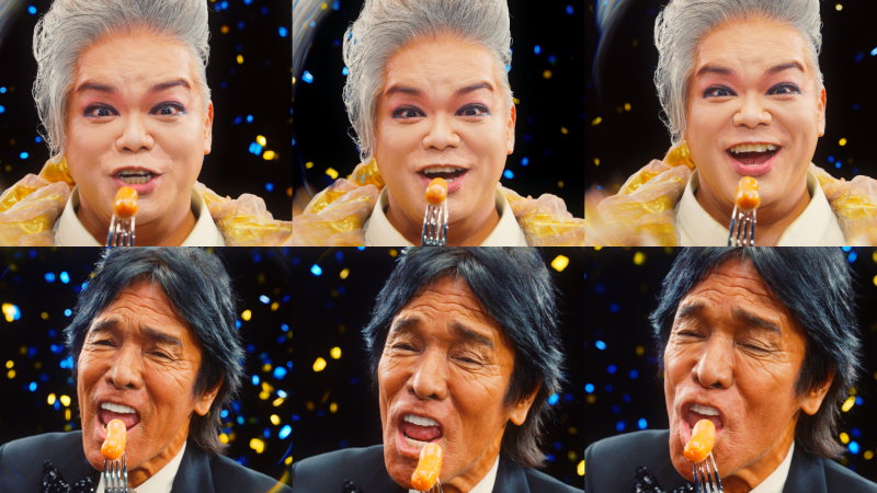 世界的ソプラニスタ・岡本知高さんが「おいちぃぃぃぃぃぃず♪」と、チーズのように伸ばして伸ばして歌い上げ、濃厚チーズのよろこびを全身で表現します。冒頭は『おいちぃず』のパッケージ登場からスタートし、岡本さんが歌い出すと同時に、カメラへぐっと距離を詰めるように迫り、表情も声量も“限界突破”へと加速。思わず息をのむほど伸びやかな独唱で、濃厚チーズの高揚感をストレートに体感させます。クライマックスでは、『おいちぃぃぃぃぃぃず』のパッケージが大きく映し出され、「※まだ続きます」のテロップとともに延長戦へ。「おいちぃぃぃぃぃぃず♪」をしっかり印象づけて歌唱終了。ここまで驚きのワンカットで進み、歌い終わった後の静けさまで含め、思わず口ずさみたくなるような余韻を残すCMに仕上がっています。