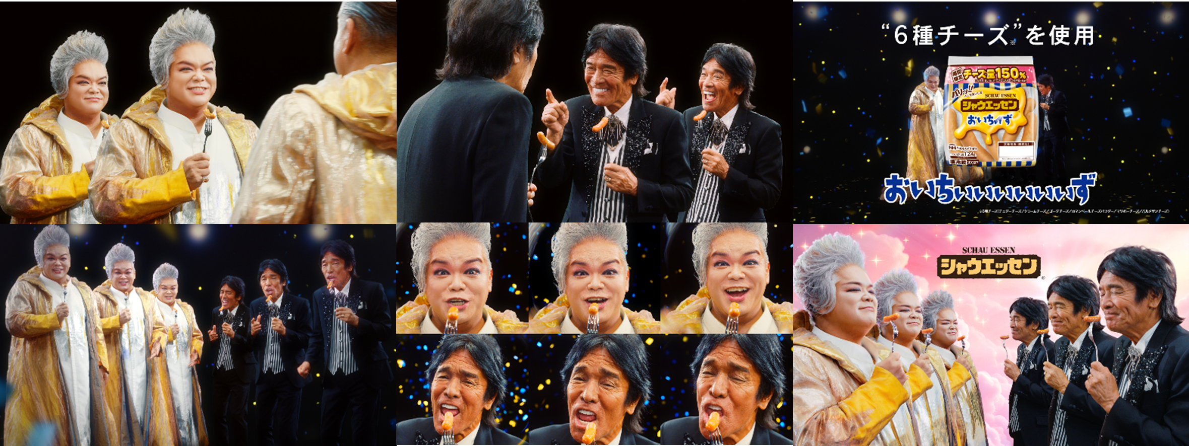 3本目のCMでは、チーズ量150%※、そして6種の濃厚チーズを表現し、岡本知高さんと松崎しげるさんがまさかの6人に進化して”六重唱”を披露。岡本さんが肩を叩かれ振り向くと、そこにはもう2人の岡本さんが登場。続いて松崎さんも肩を叩かれると、さらに2人の松崎さんが現れ、2人が6人へと増え、6人で呼吸を合わせた瞬間、魅惑の合唱がスタート。岡本さんのオペラティックなロングトーンに、松崎さんの情熱的なシャウトが重なり、6人で織りなす魅惑のハーモニーで濃厚チーズのよろこびを全身で表現します。「おいちぃぃぃぃぃぃず♪」の余韻をしっかり印象づけ、歌い終わった後の静かな余韻の中で、『おいちぃぃぃぃぃぃず』をパリッ!!と食べる6人の幸せな表情でCMは終わります。ステレオサウンドを活かし、6人の声が左右から立体的に聞こえる演出で、その場で合唱を聴いているような臨場感です(イヤフォン推奨)。