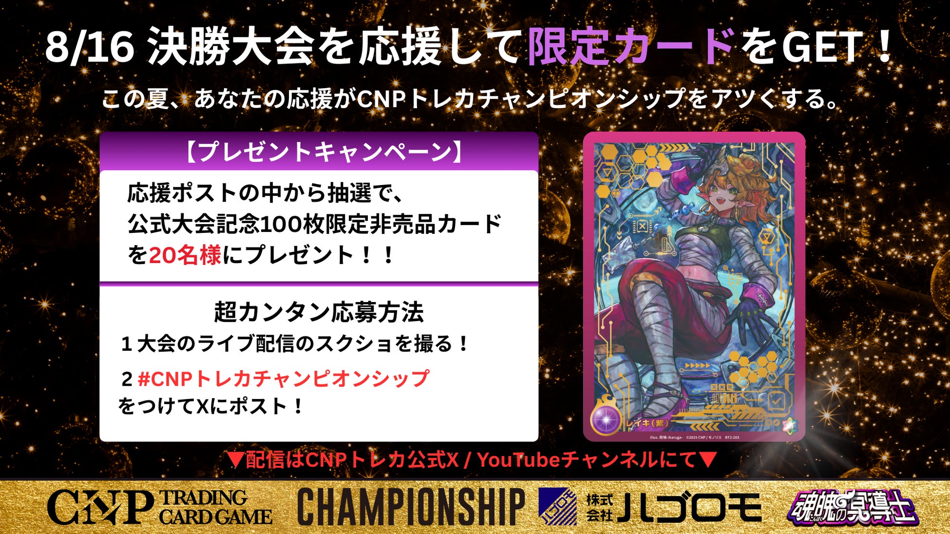 「CNPトレカ」を展開するモノリス株式会社(本社:東京都渋谷区、代表取締役:齋 善晴、以下当社)は、2025年8月16日(土)に第2弾「魂魄の冥導士」の発売発表を行い、同日にCNPトレーディングカードゲーム CHAMPIONSHIP 2025 supported ハゴロモの決勝トーナメントを開催します。