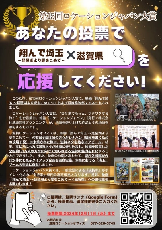 11月8日、第15回ロケーションジャパン大賞のノミネート作品・地域が決定され、映画「翔んで埼玉 ~琵琶湖より愛をこめて~」および滋賀県等がノミネートされました。