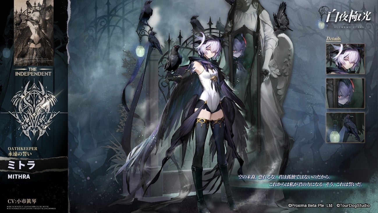 「永遠の誓い」の称号を持つ【ミトラ】は、★6森属性の無勢力者です。ロンギヌス一族出身の【ミトラ】は、二千年もの間星々の秘密を守る使命を担ってきました。控えめで慎重な彼女は、鋭い才気を黒い羽に隠しています。