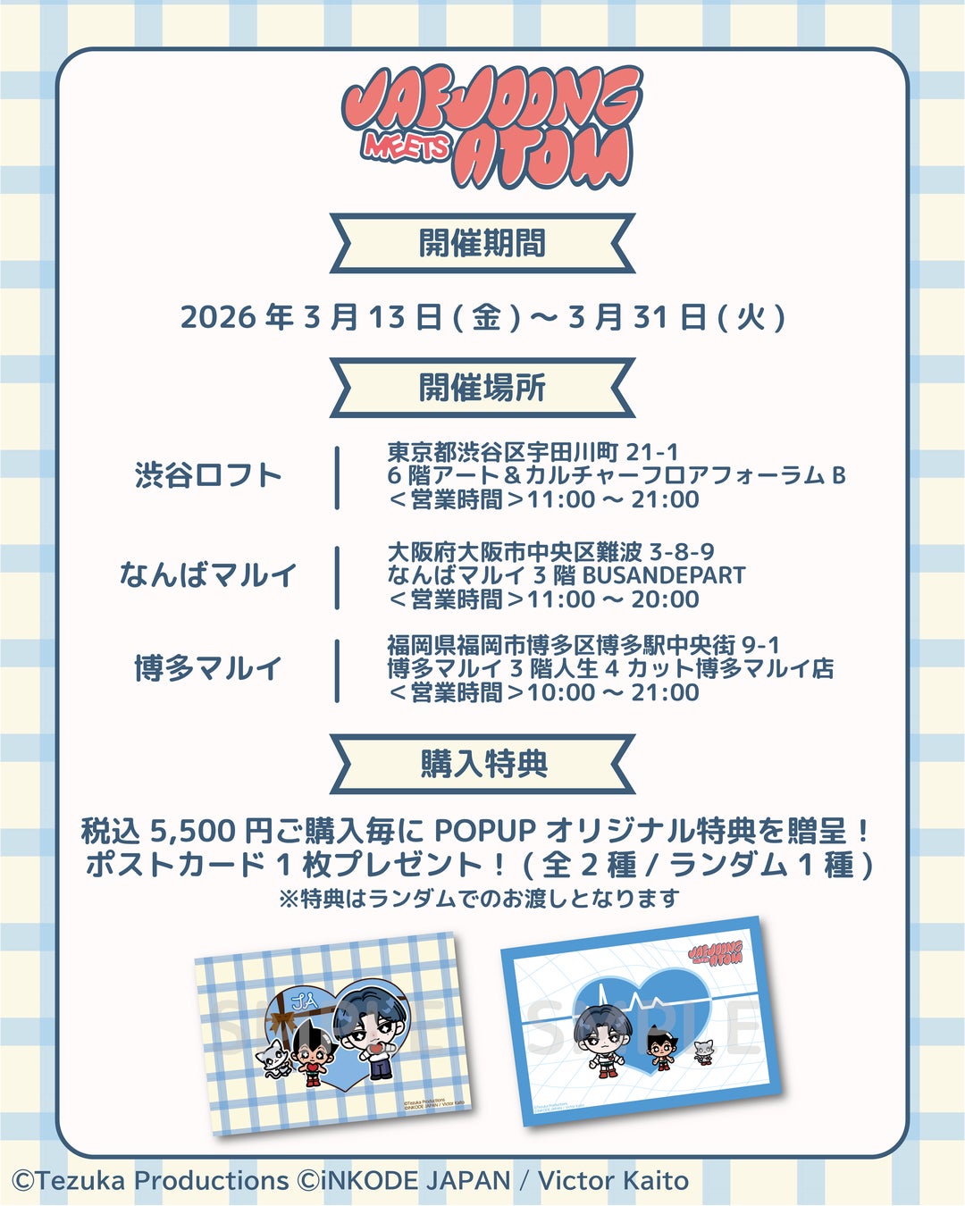 この度、株式会社iNKODE JAPAN(本社:東京都千代田区、代表取締役社長:安正濱)は、 iNKODEに所属するK-POPアーティスト、JAEJOONG(ジェジュン)の日本公式キャラクター『JAELUV&CAPPY』と、株式会社⼿塚プロダクション(本社:東京都新宿区、代表取締役:松⾕ 孝征、以下「⼿塚プロダクション」)を版権元とする手塚治虫作品『鉄腕アトム』とのコラボキャラクターを、株式会社GLOBE(本社:東京都江東区、代表取締役:小島 芳実)に所属するアーティストVICTOR KAITOがデザインし、誕生した『JAEJOONG MEETS ATOM』のPOP UP STOREを開催いたします。