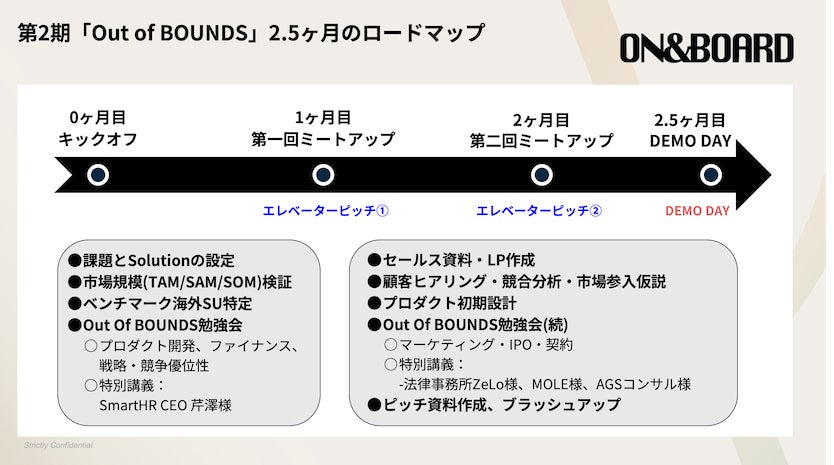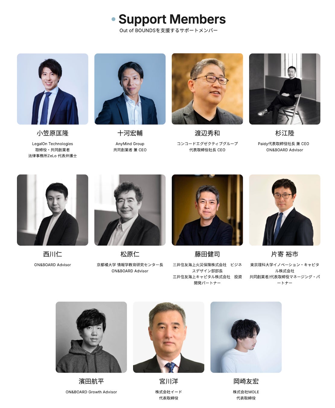 ON&BOARDは、「有望な事業テーマの発掘」と「創業可能性の徹底検証」を行うスタートアップスタジオ機能を持っています。その中で、創業支援プログラム「Out of BOUNDS」を運営し、起業家支援を行なっています。