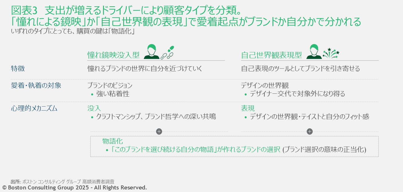 高額消費者の顧客タイプには没入型・自己表現型の2種類があり、愛着の起点がブランドか自己かで心理的メカニズムが異なります(図表3)。いずれのタイプにとっても、購買の鍵は「物語化」です。買い物のプロセスや場の空間演出を含む特別な体験が、“心に残る意味”となって関係性を育て、次の購買につながります」