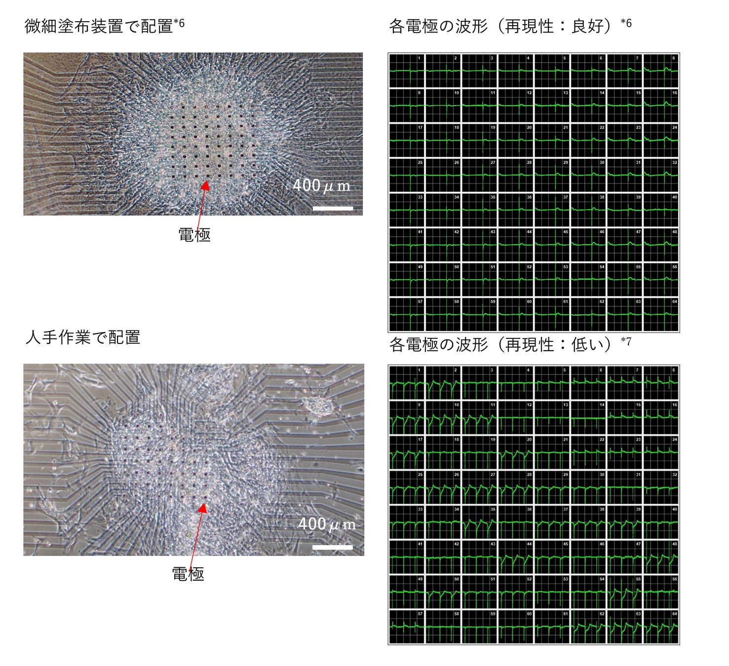 直径3~6mm×深さ10~13mmの多数の凹み(マルチウェル)の底に電極を設けたプレート(多電極アレイ)上の電極上に適量のiPS心筋細胞を配置し、心臓の拍動など細胞の電気的な活動を測定する創薬実験において、電極上にiPS心筋細胞の必要量のみを定位置に配置し、より正確な細胞の拍動の測定が可能となりました。