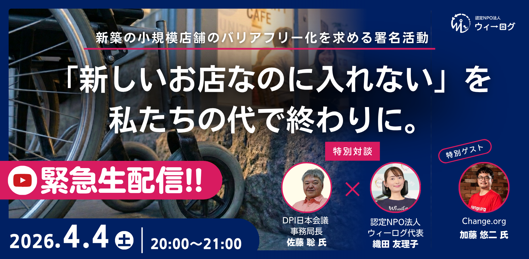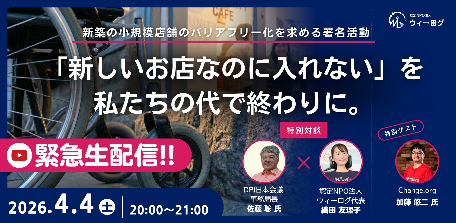 車いすでもあきらめない世界をつくる認定特定非営利活動法人ウィーログ(代表理事:織田友理子)は、2026年3月5日より新しく建てるすべての店舗において「段差ゼロ」を標準化することを求める署名活動を開始いたしました。