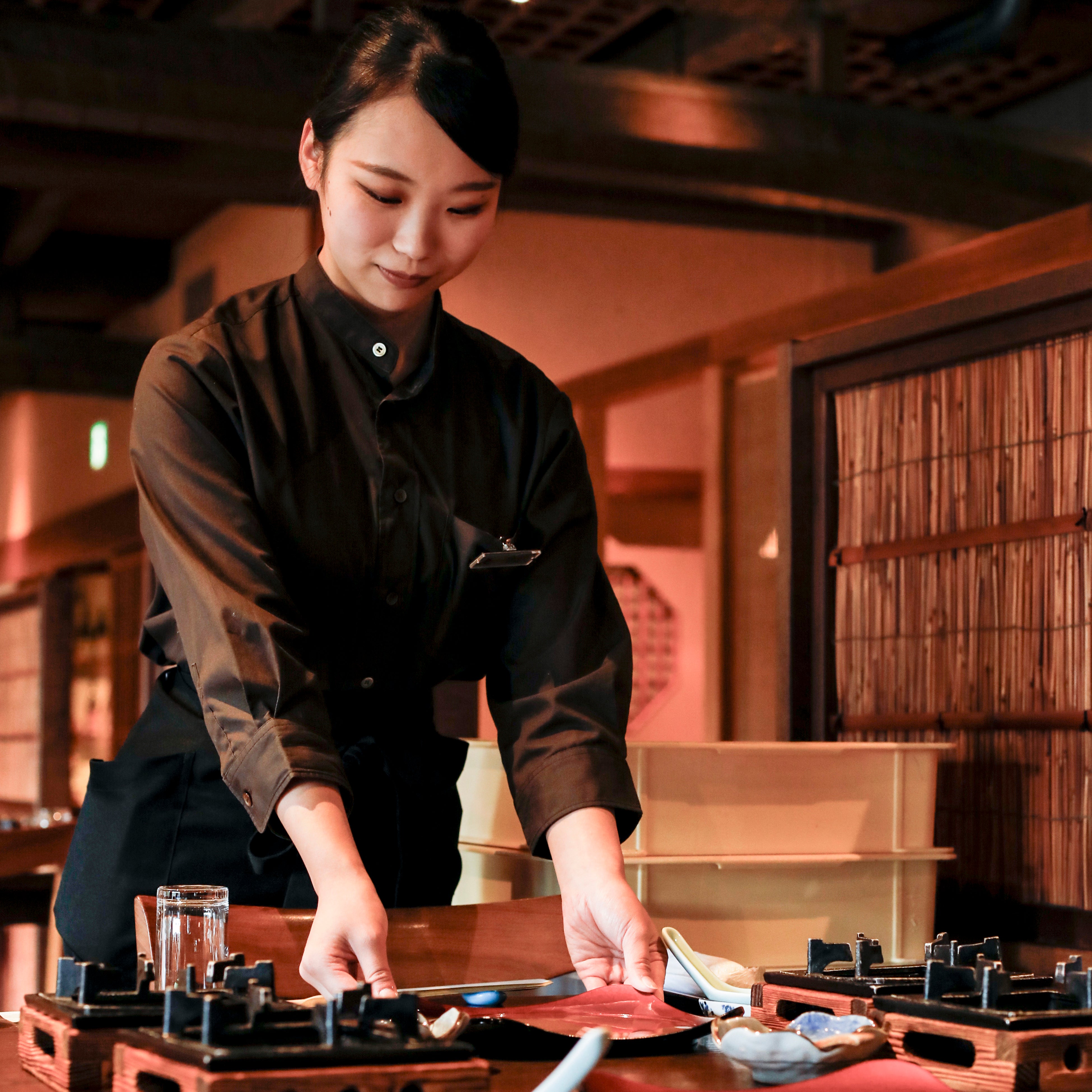 接 客:創業90年を迎える老舗ホテル金波楼。一つ一つのお料理を、最高のタイミングでご提供します。日本海の絶景を眺めながら、心安らぐサービスのもとで、ごゆっくりお楽しみください。