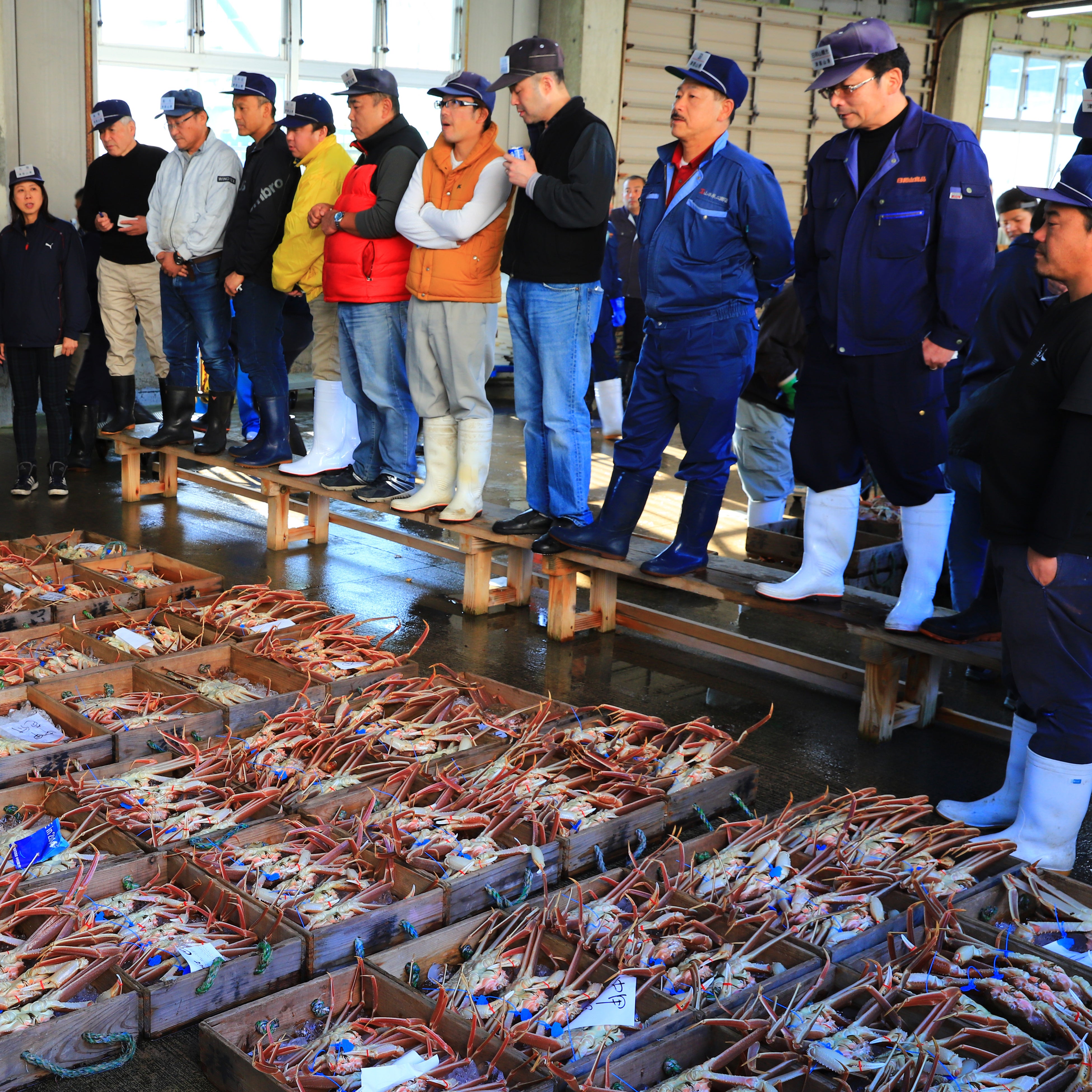 セリ人:頑丈な殻に包まれたカニの身入りは、外からの判別は非常に困難。毎朝のセリでは当社のセリ人が良質なものを厳選し、かに道楽やホテル金波楼等へ直送しています。