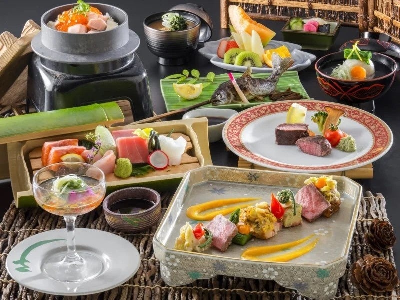 戸川渓谷の清流で育った山女魚をはじめ、信玄鶏や梨北米など、山梨の恵み豊かな地元食材にこだわり、旬の新鮮な野菜や果物を使用した会席料理をご用意しております。四季折々の味わいを繊細に仕立てたお料理を楽しめます。
