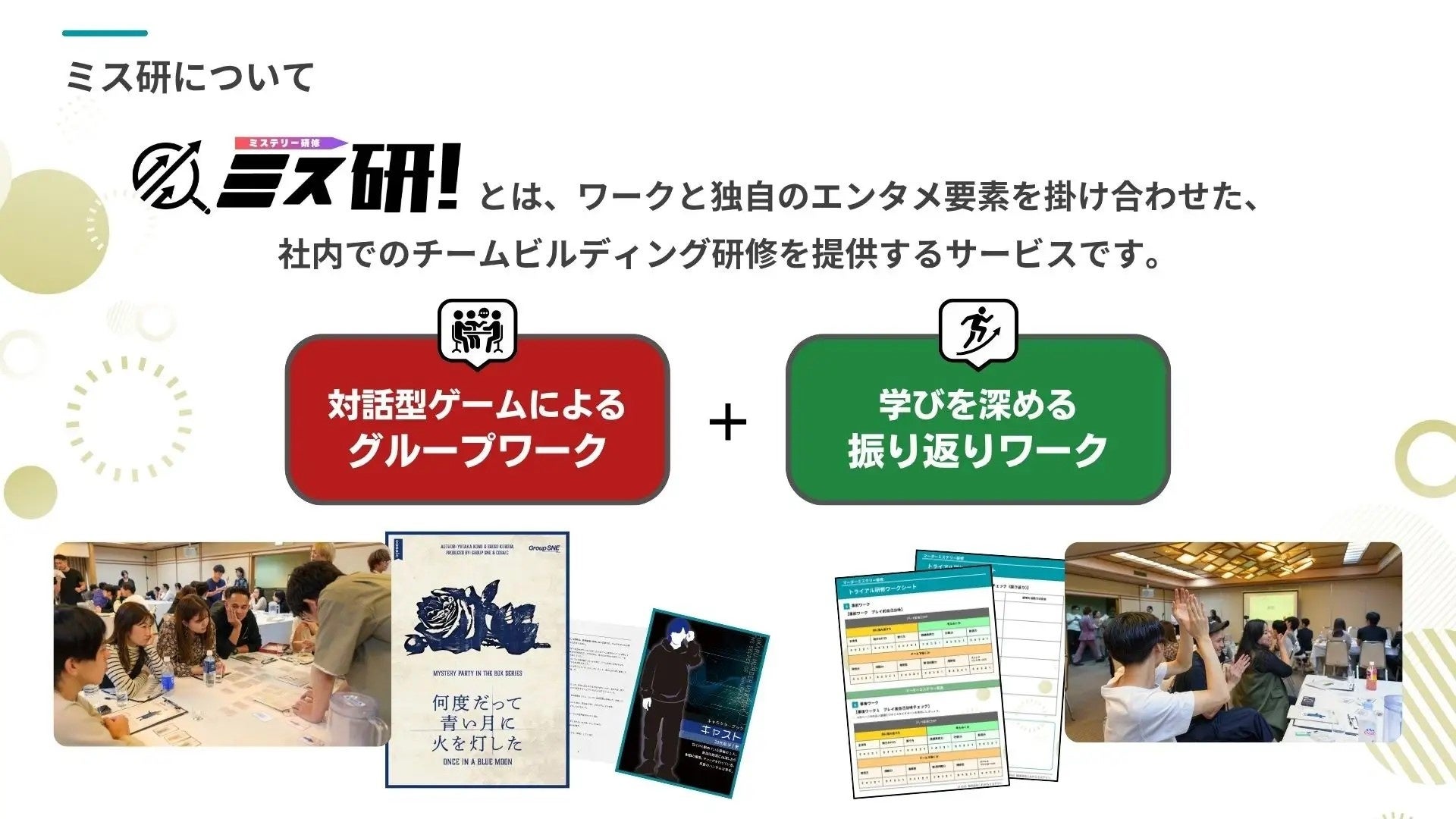 ワークと独自のエンタメ要素を掛け合わせた、社内チームビルディング研修を提供するサービスです。