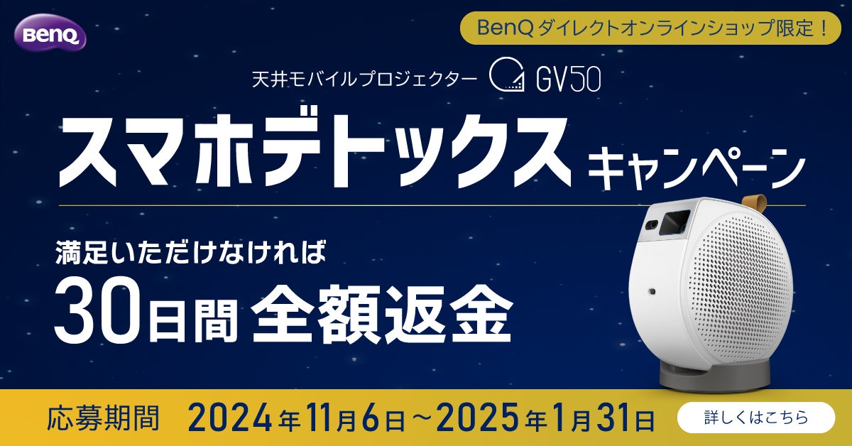 ベンキュージャパン株式会社(本社:東京都千代田区、以下BenQ)は、天井モバイルプロジェクターGVシリーズ新製品「GV50」の発売に際して、2024年11月6日(水)~2025年1月31日(金)の期間中、BenQダイレクトオンラインショップより「GV50」を購入した方全員に、30日間全額返金保証、およびSNS投稿いただいた方にもれなく「Amazonギフト券1000円分」を進呈するキャンペーンを開催します。