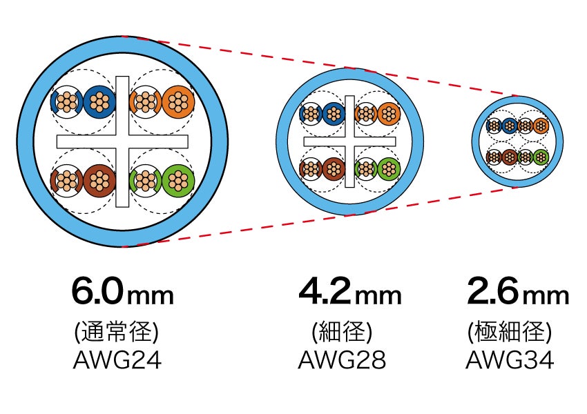AWG34の導体を採用することによって、標準的なAWG24のLANケーブルと比較して約57%の細径化を実現。