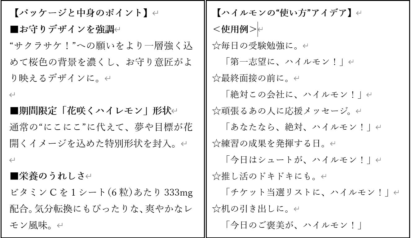 1980年の発売以来、ハイレモンは“やさしい酸味とレモンの爽やかさ”で幅広い世代に愛されてきました。受験や就活が本格化する12~2月は、合格祈願グッズが店頭に増える季節。昨年から当社では「志望校や志望企業に“入る”」という語呂にちなみ、がんばる人を後押しする“お守り”発想の期間限定パッケージ「ハイルモン」を展開。2年目の今年は、“サクラサケ!”への願いをより一層強く込めて、桜色の背景を昨年より濃くし、店頭で目に留まりやすいデザインに進化。試験や面接に持ち歩きやすい箱形態はそのままに、さらに“気持ちを整える相棒”になることを目指しました。試験会場や最終面接のお守りとして、また家族や友人へ気軽に渡せる“応援ギフト”として幅広く活用いただけます。
