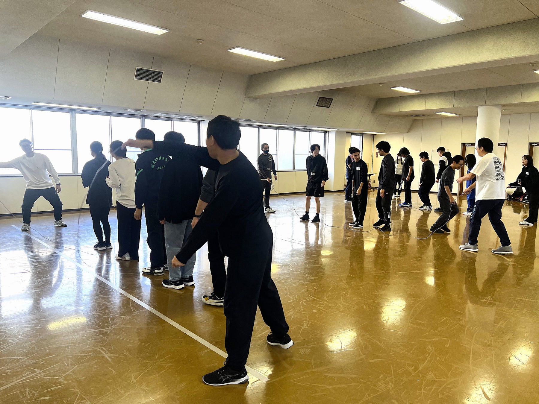 7メートルの特大LANケーブルを大縄と見立て、チーム対抗で跳んだ回数を競いました。