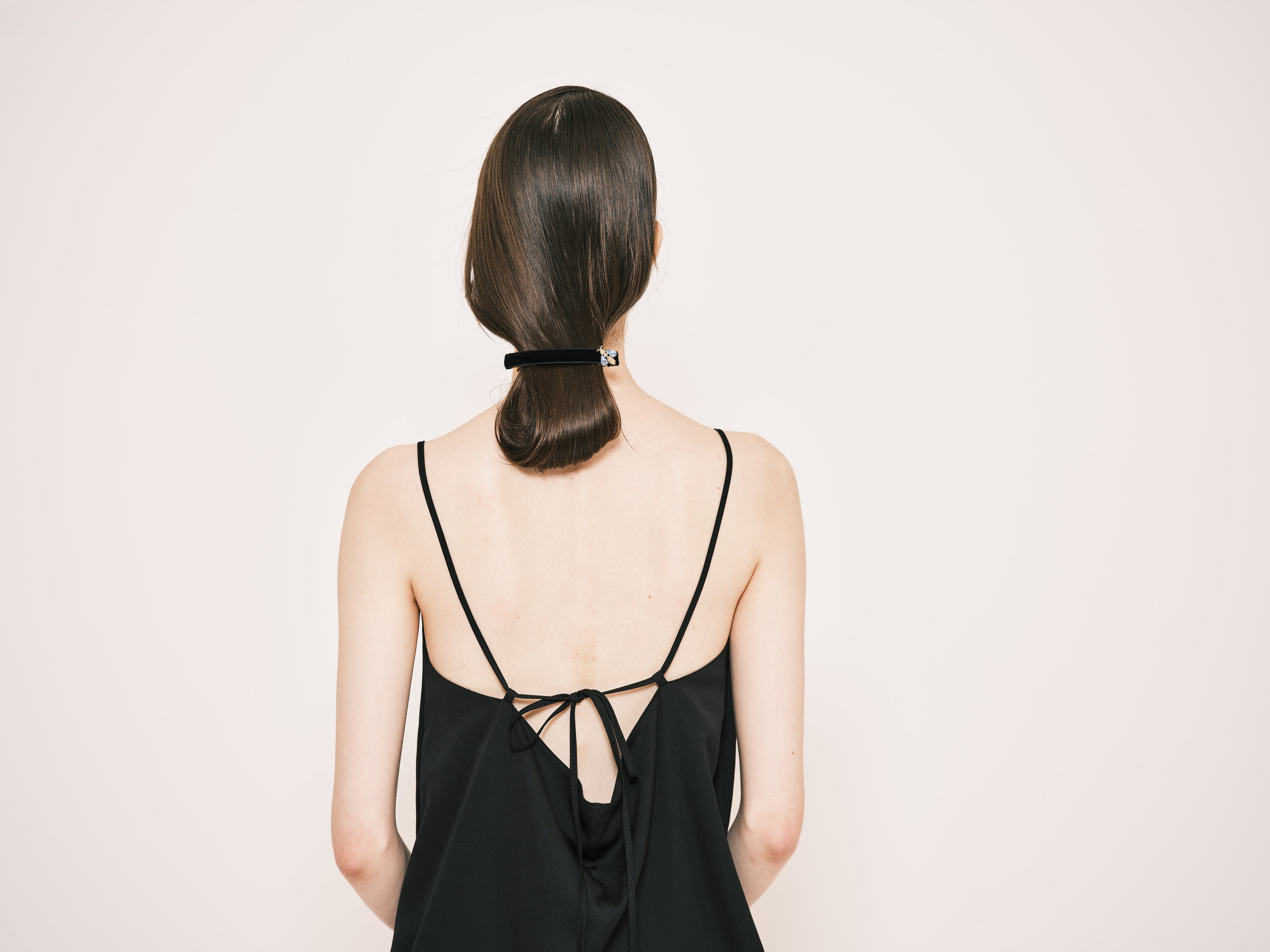 ブラックベルベットのベースがフォーマルな印象を演出。余裕のあるサイズ感で髪が多めの方のハーフアップや、標準〜軽めの毛量の方のポニーテール、*ギブソンタックなどのまとめ髪に向いています。単品使いはもちろん、同シリーズのポニーやボビーピンなどと合わせればより華やかな雰囲気をお楽しみいただけます。