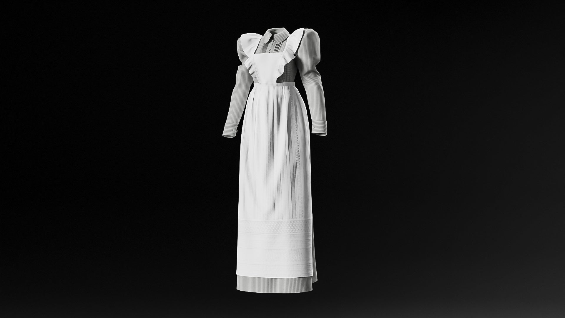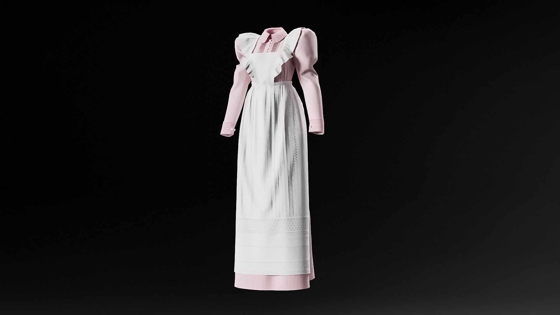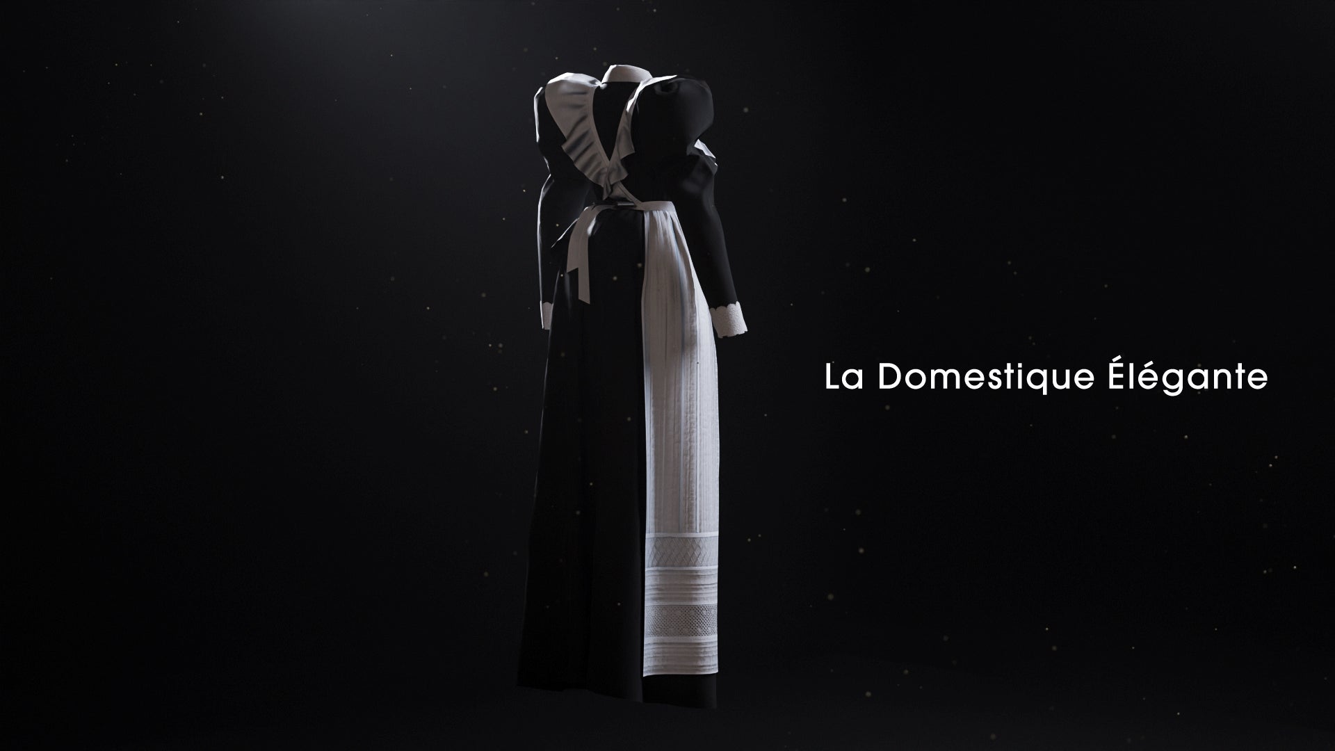 このデジタルファッションは、1880年ヴィクトリア朝、メイド全盛期。ファッションにおいてはバッスルスタイルが流行している時期にヨーロッパに咲いたクラシックなメイド服をベースに、時代を超えて昇華した一着。レースのエプロン、コルセットを想起させるウエストライン、ふわりと広がるスカートとジゴスリーブ。ディテールには、当時の手仕事の繊細さと気品を宿らせました。