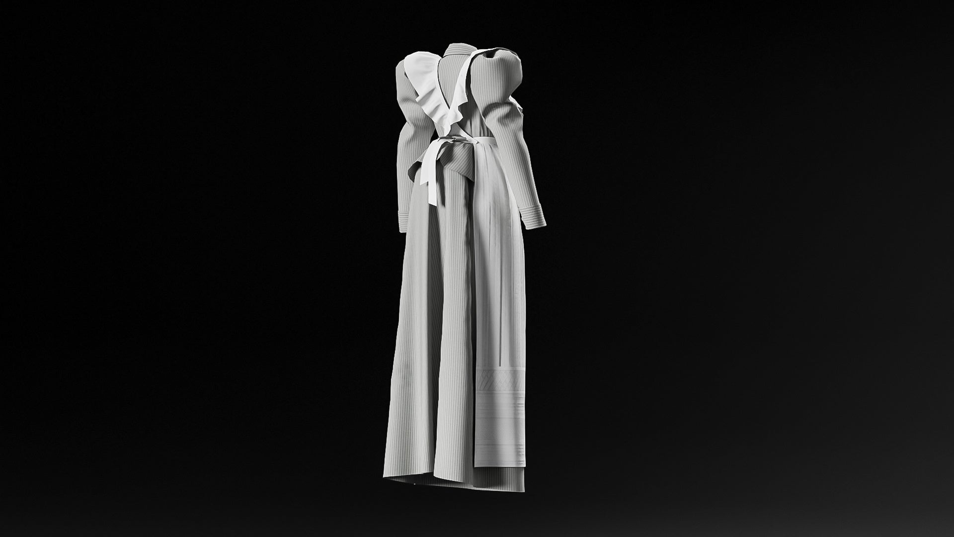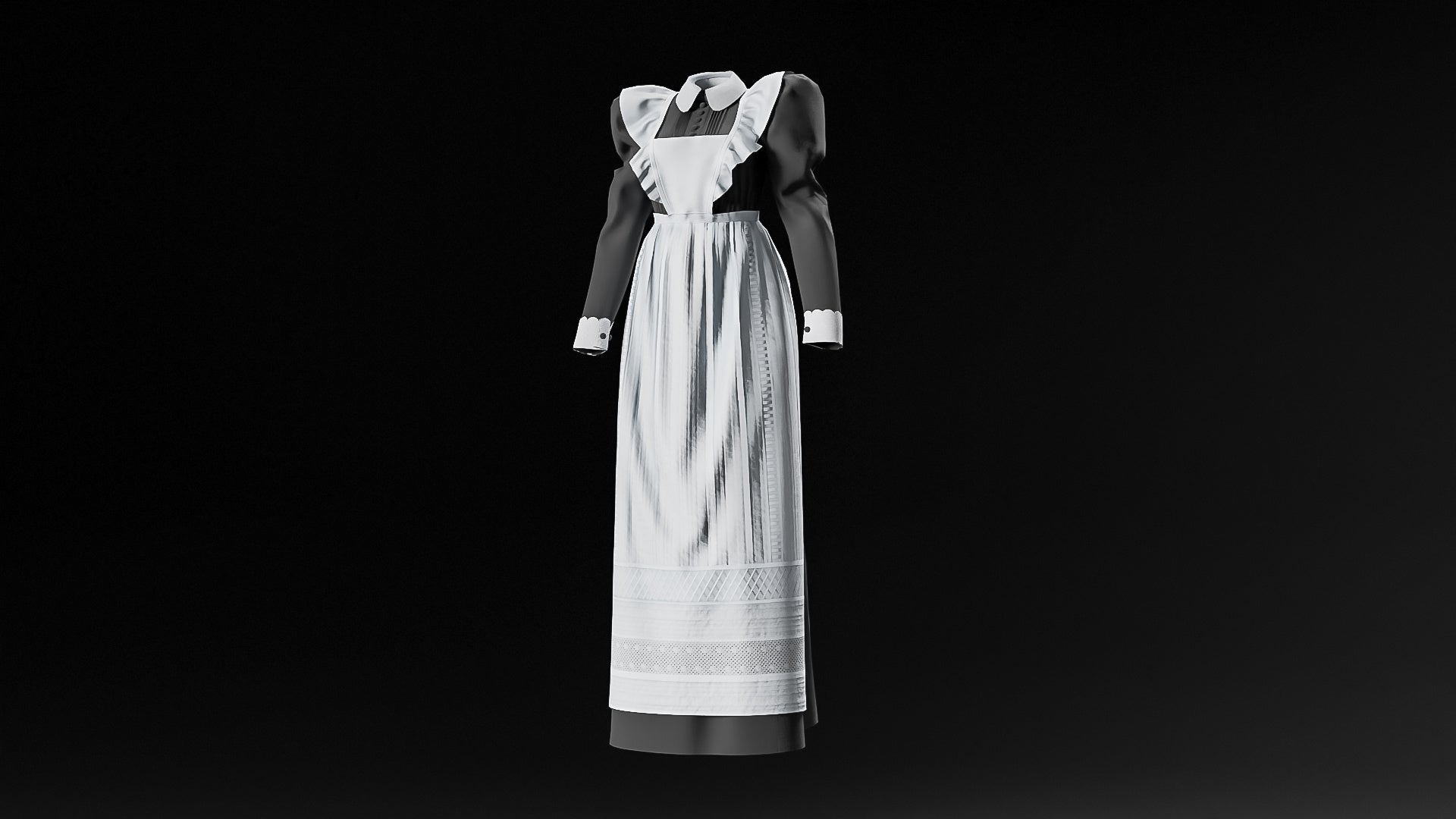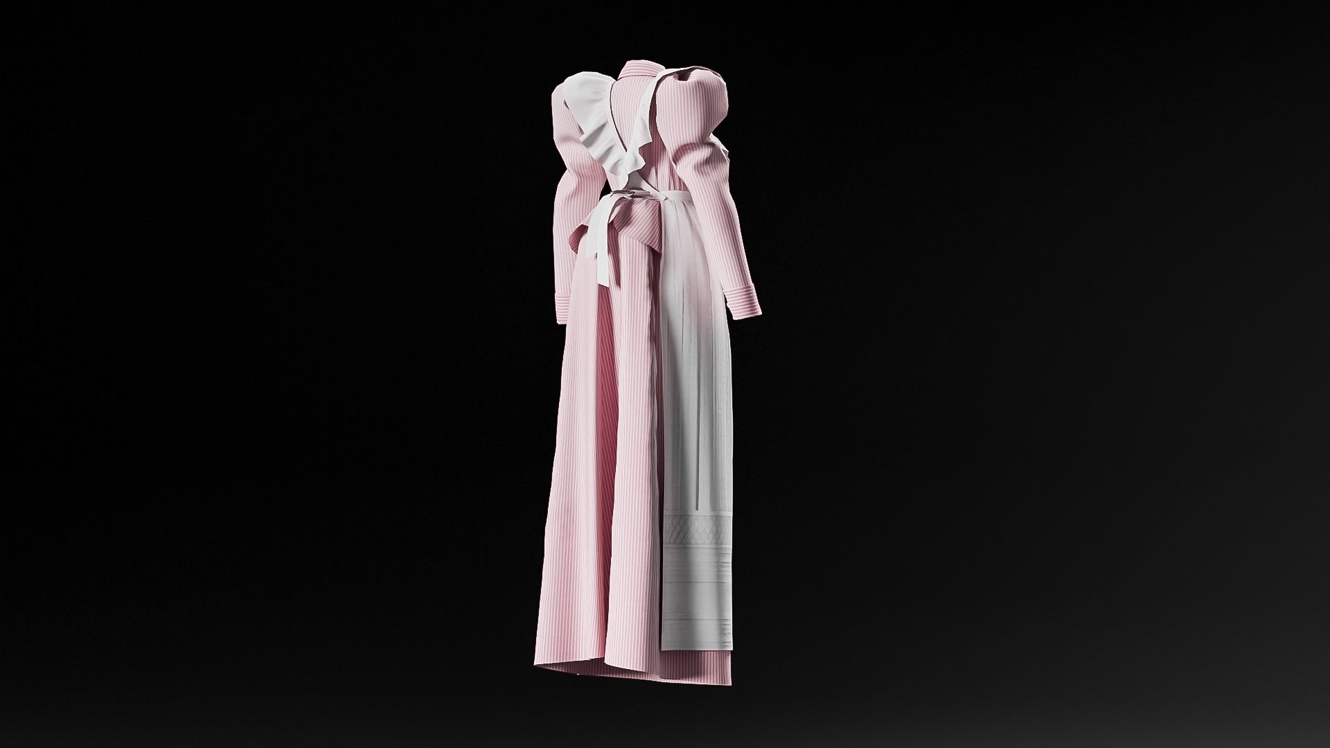 このデジタルファッションは、1880年ヴィクトリア朝、メイド全盛期。ファッションにおいてはバッスルスタイルが流行している時期にヨーロッパに咲いたクラシックなメイド服をベースに、時代を超えて昇華した一着。レースのエプロン、コルセットを想起させるウエストライン、ふわりと広がるスカートとジゴスリーブ。ディテールには、当時の手仕事の繊細さと気品を宿らせました。