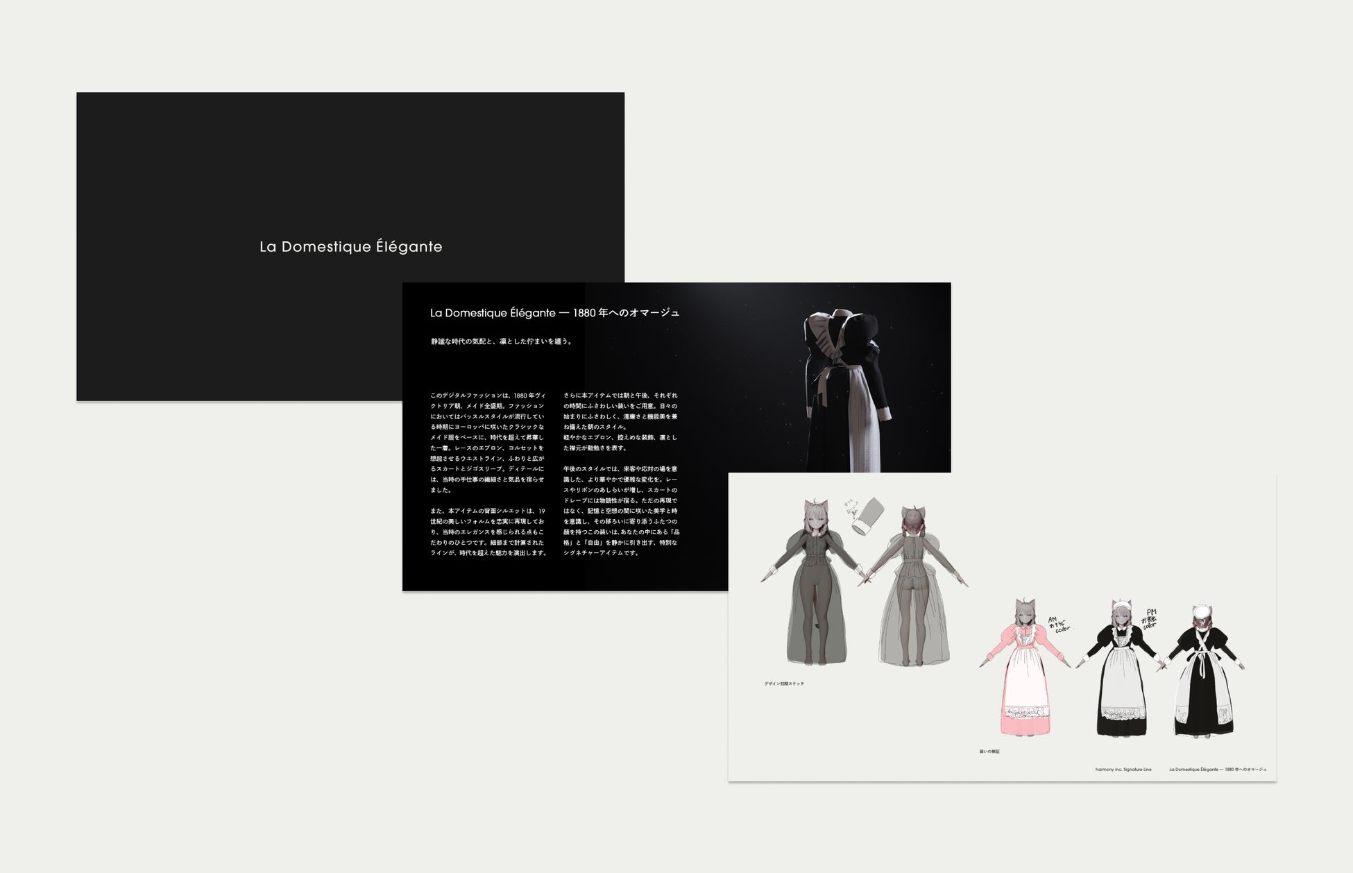 harmonyが誇るチームが腕によりをかけて制作するのがこのシグネチャーラインです。今後デザインと品質にこだわり抜いたアイテムの数々を皆様にお届して参りますので是非ご期待ください。そのシグネチャーラインの第一弾としてリリースしたのが、VRChat内でも高い人気を誇るメイド服です。「La Domestique Élégante — 1880年へのオマージュ」は、1880年代のメイド服を忠実に再現し、従来のVRChat向けメイド服に新たな視点を加えることを目指しました。メイド全盛期の当時の装いは、現代の私たちが見落としがちな尊さを思い出させてくれます。その古き情景を、デジタルファッションがもつ無限の可能性と掛け合わせることで、衣服が持つ奥深さや語り継がれる力をさらに引き出せればと願っています。今回は朝のお掃除などをする装いとお昼以降のティータイムなどの装いを制作したので、メタバース上でも時間経過によって変わる雰囲気をお楽しみください。この服に身を包むひとときが、皆様に新しい発見とささやかな喜びをもたらすことを心より期待しています。