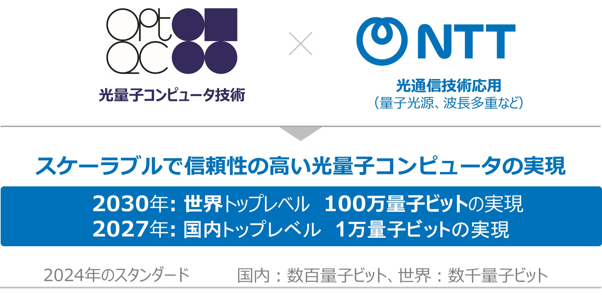 OptQCとNTTは、OptQCが有する光量子コンピュータ開発技術と、NTTが有する光通信技術を融合し、スケーラブルで信頼性の高い実用的な光量子コンピュータの実現をめざします。具体的には、量子コンピュータの実用性の指標となる100万量子ビット規模のスケーラビリティと、信頼性を担保する誤り耐性技術の確立を、2030年までに達成することを目標としています。