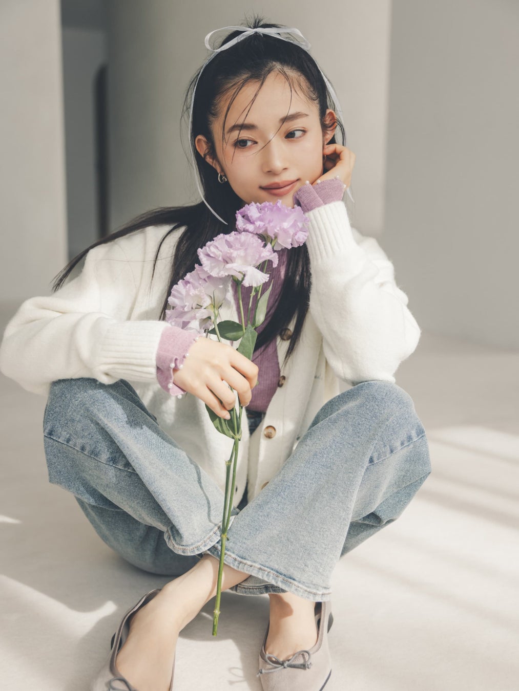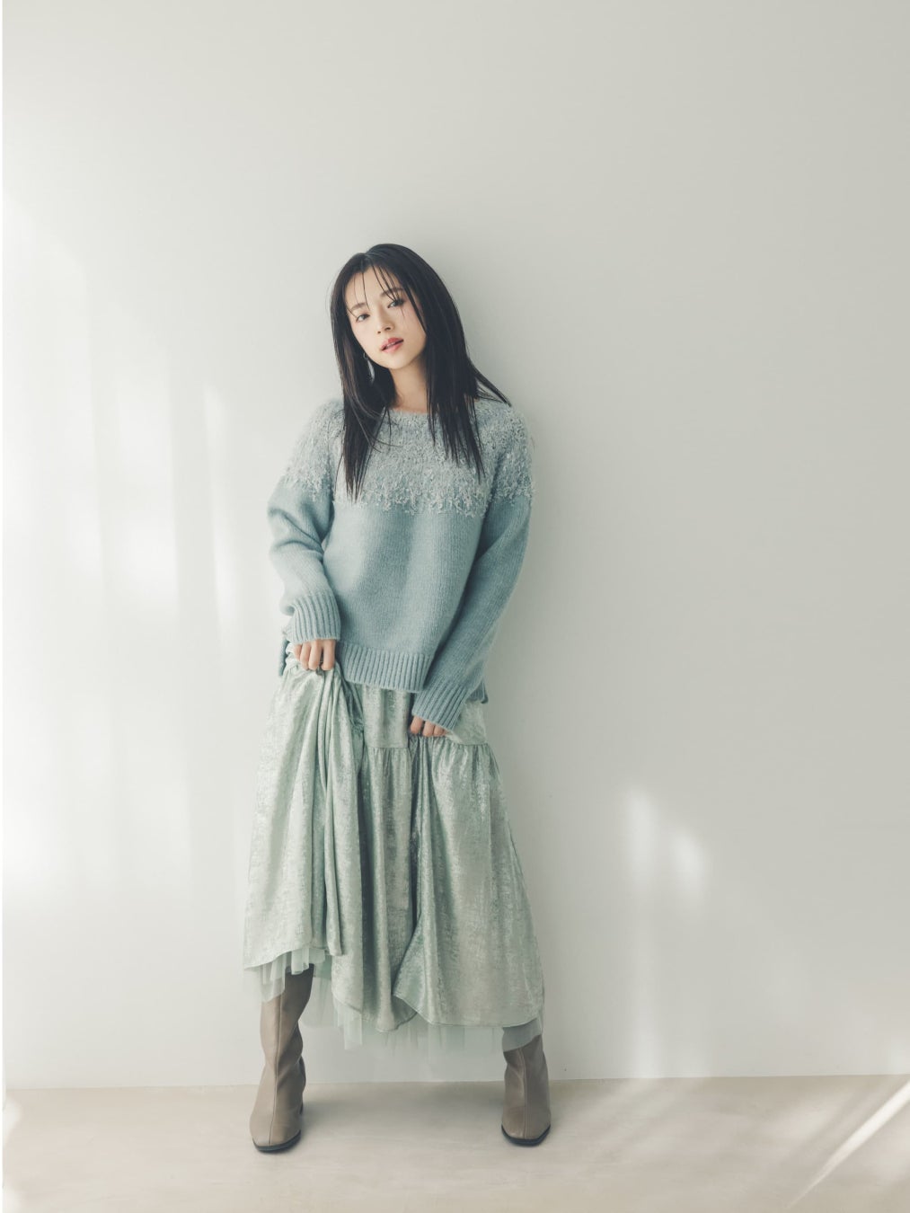 柔らかで毛足のあるフェザーヤーンを使ったカーディガンは、スクエアモチーフのクロシェ風柄に編み立てることで、春らしい透け感のある軽やかな仕上がりに。曖昧なカラーを重ねた軽やかなチュール素材が織りなす、レイヤードスタイルは、まるで春の風に乗ってひらひらと揺れる花びらのようです。