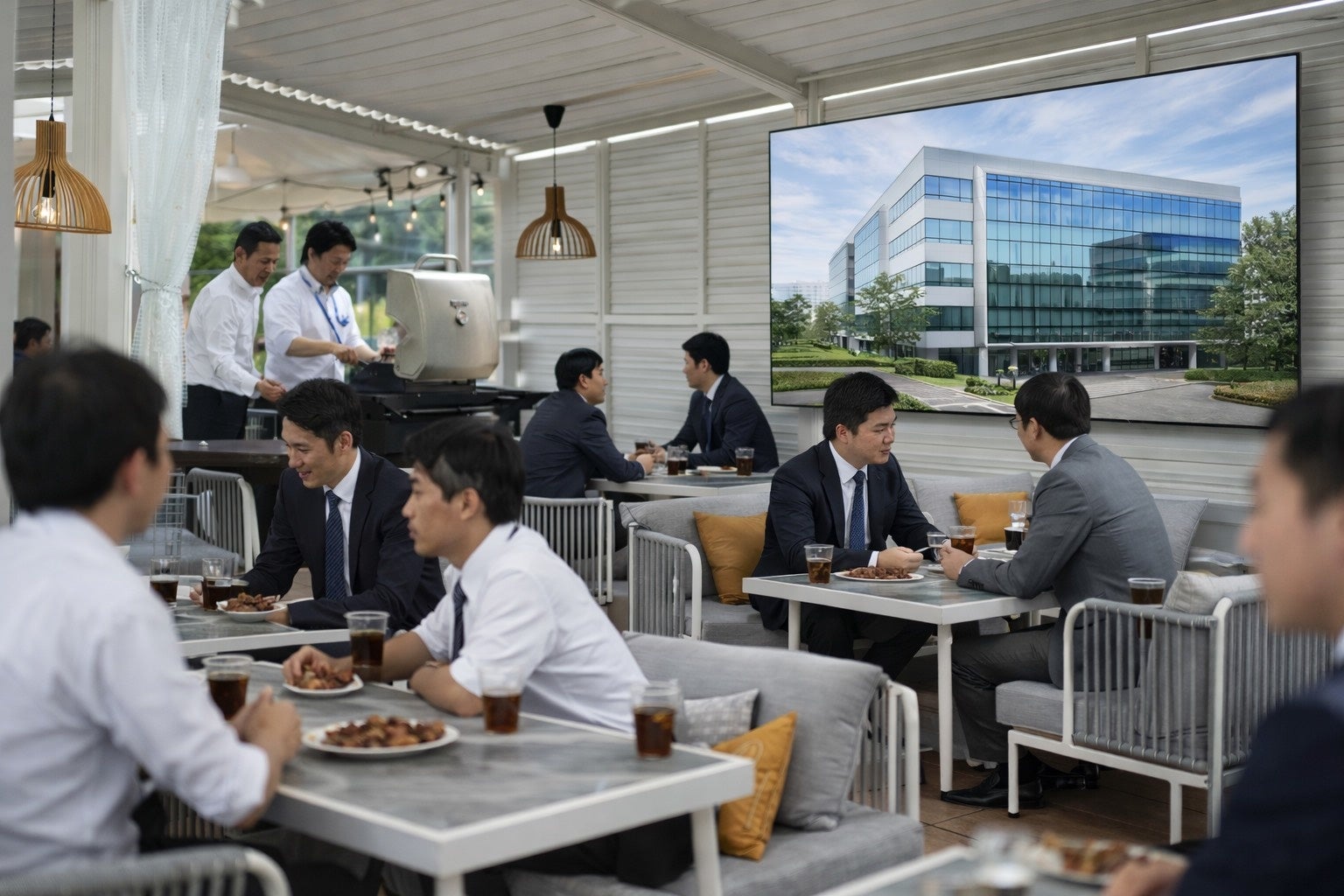 全席ガスグリルで調理もスムーズ。大型モニターを使った演出もでき、キックオフや全社懇親会など大人数での利用におすすめです。