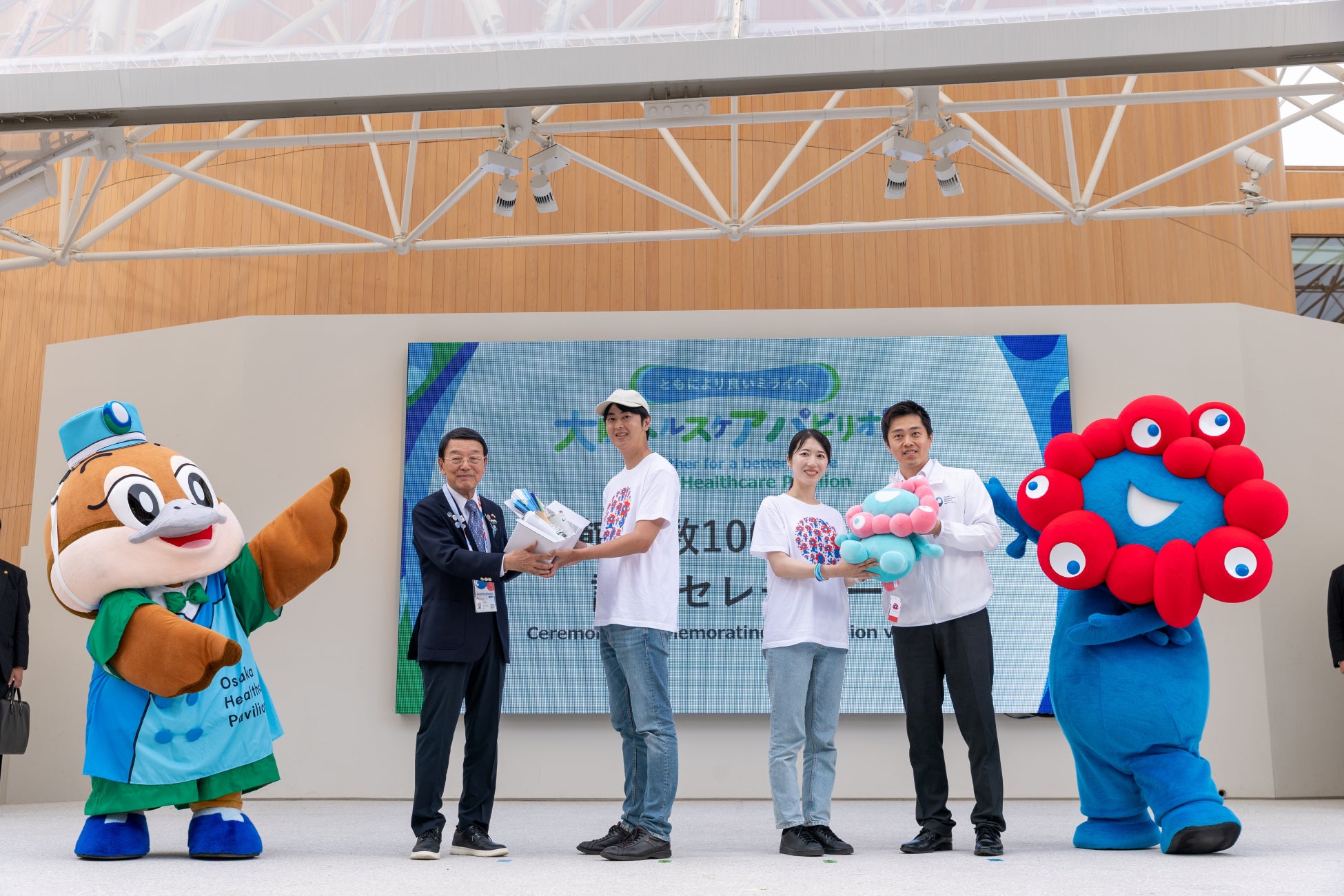 記念セレモニーは大阪ヘルスケアパビリオン リボーンステージで執り行い、吉村大阪府知事、大阪ヘルスケアパビリオン館長 西澤良記、ミャクミャク、大阪パビリオンもずやんも登壇し、記念品の贈呈や記念撮影を実施しました。