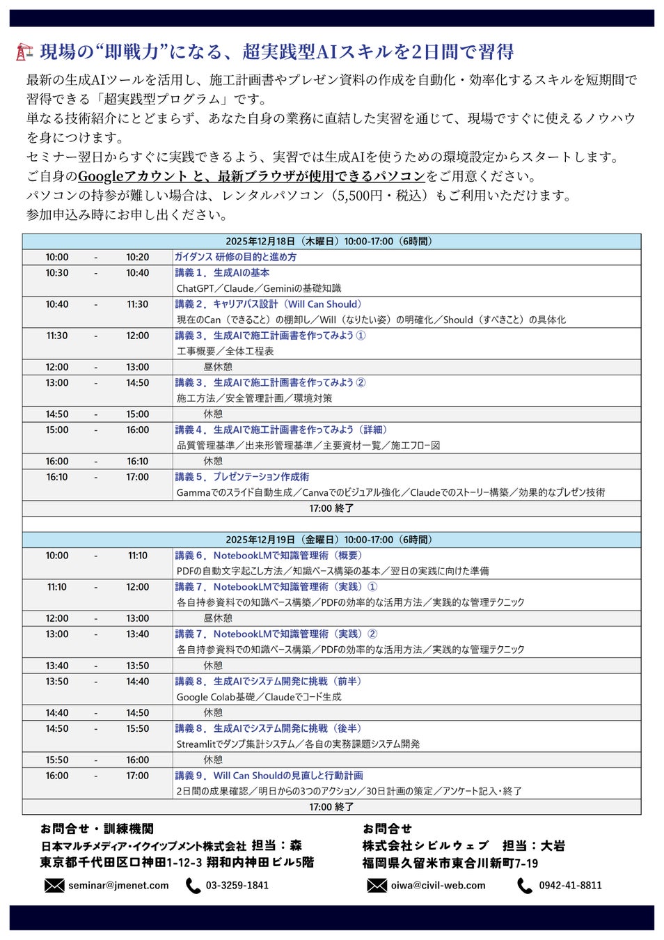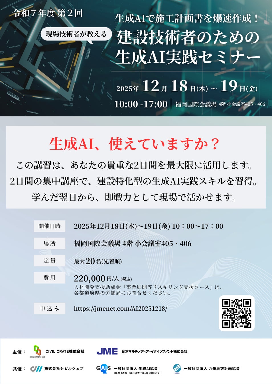 建設業界に特化した生成 AI 活用の実践セミナー 「生成 AI で施工計画書を爆速作成!建設技術者のための生成 AI 実践セミナー」が、 2025 年 12 月 18 日(木)・19 日(金)の 2 日間、福岡県博多にて開催されます。