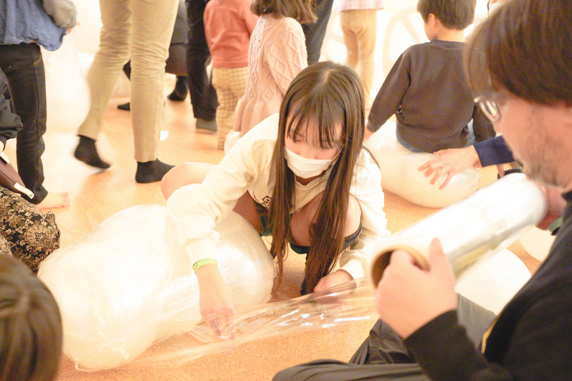 そして、2025年2月からは、特に好評の声が多かった「バルーン・モンスター」が大きなお皿に再び帰ってきます。膨らませた風船を梱包用のラップで強く巻いてつなぎ合わせて作る遊具は、ふわふわ、モコモコ、ぐにゃぐにゃ、奇妙な形をしています。日々風船を作り直すので、日によって形が変わり進化していくのも特徴です。風船によじ登ったり、寝転んだり、はたまた巨大なモンスターの下をくぐったりして、未だかつてない風船あそびを楽しむことができます。