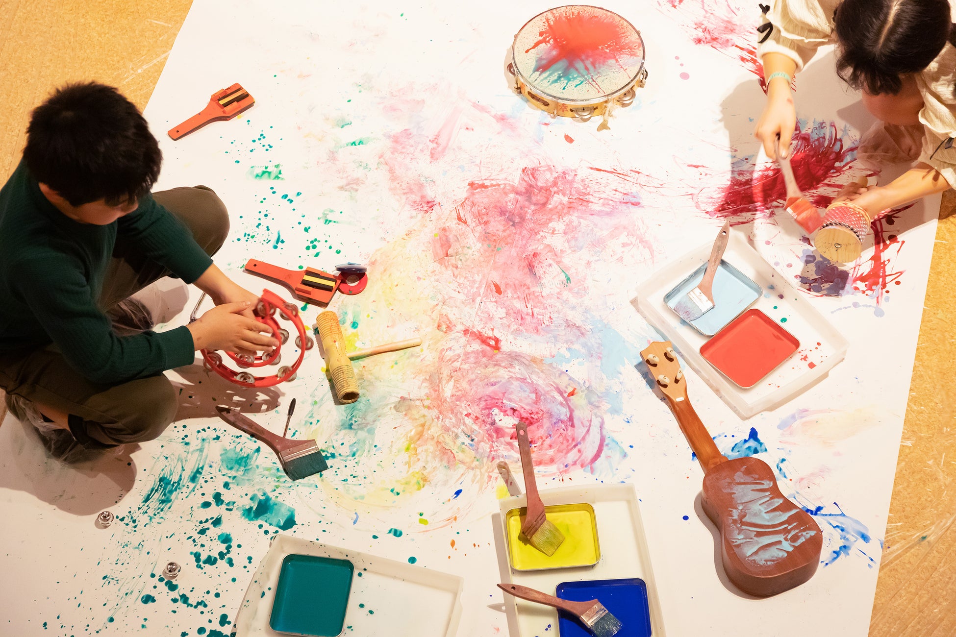 楽器にインクや絵の具で色をつけて、目に見える「音のカタチ」として描く特別イベントです。楽器の形状や実際の音で模様を描き、大きな絵を完成させます。対象となる楽器は、「壊れてしまった・家に眠っている」など、今は使用していない楽器を事前募集し、子どもたちのあそび「音筆」に生まれかわらせます。