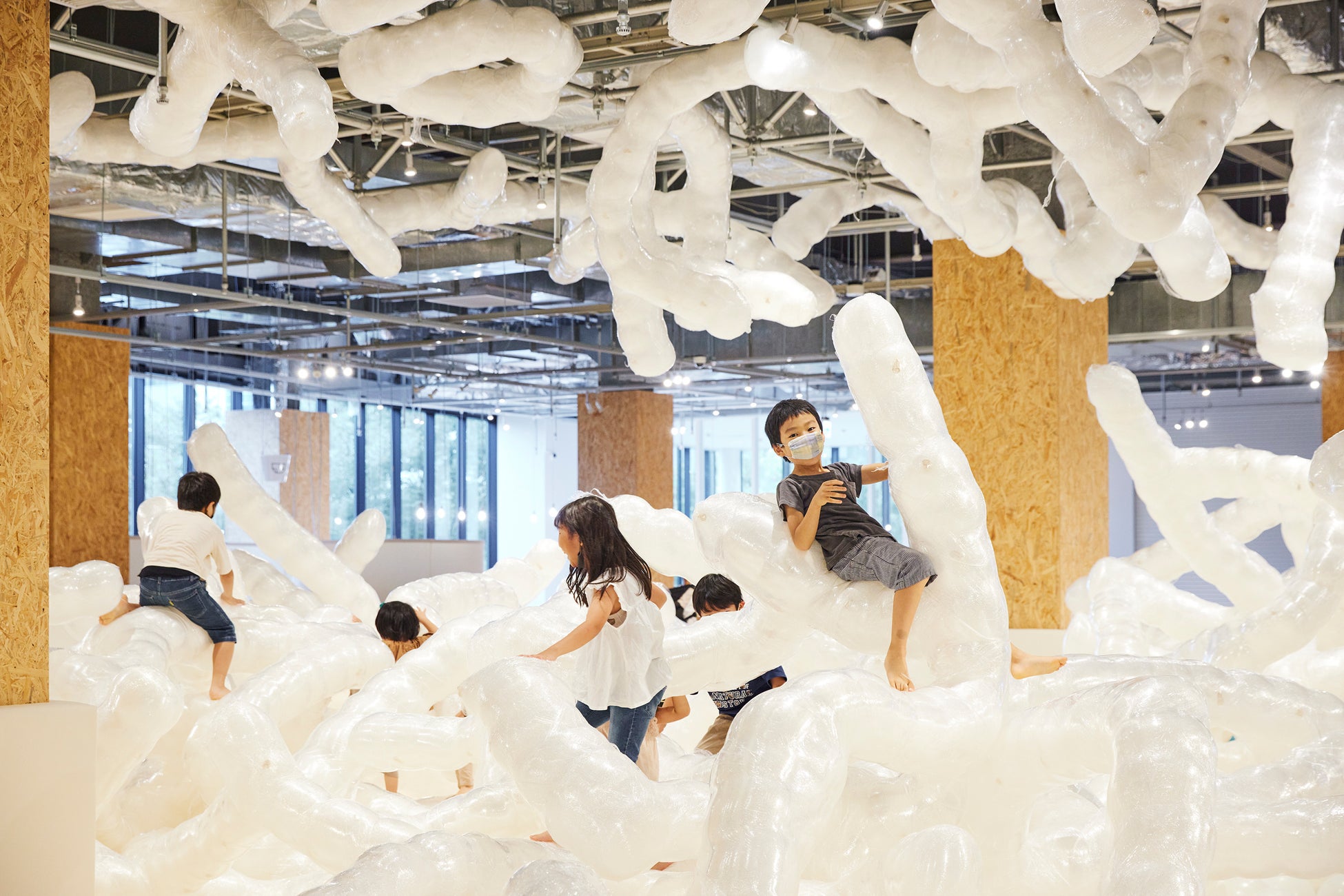 PLAY! PARKは、子どもたちが自由な発想で遊べる新しい屋内広場です。約1,000㎡の空間の中心には、〈大きなお皿〉と呼ばれる楕円型フィールドがあり、約半年周期で建築家やクリエイター、美術や建築を学ぶ学生たちと共同で、オリジナルの遊具を開発・制作しています。これまでは、新聞紙や布、平テープなど身近な素材で6種類の大きな遊具を展開してきました。
