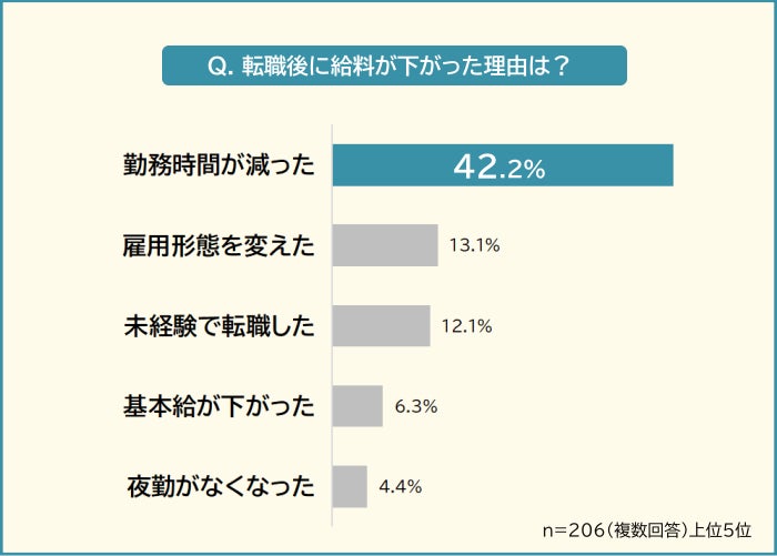 一方、転職で給料が下がった人も4割ほどいます。「転職後に給料が下がった理由」を聞いたところ、ダントツは「勤務時間が減った(42.2%)」でした。2位「雇用形態を変えた(13.1%)」、3位「未経験で転職した(12.1%)」が続きます。