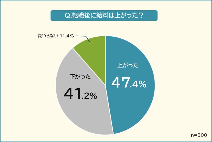 転職経験がある500人に「転職後に給料はどう変化したか」を聞いたところ、給料が上がった人は47.4%で、半数に達しませんでした。
