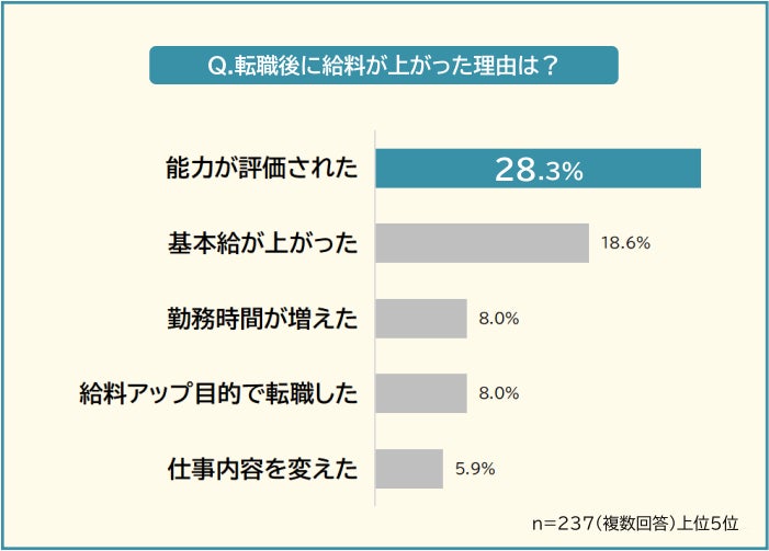 転職で給料が上がった237人に聞いた「転職後に給料が上がった理由」の1位は「能力が評価された(28.3%)」でした。2位「基本給が上がった(18.6%)」も多くなっています。