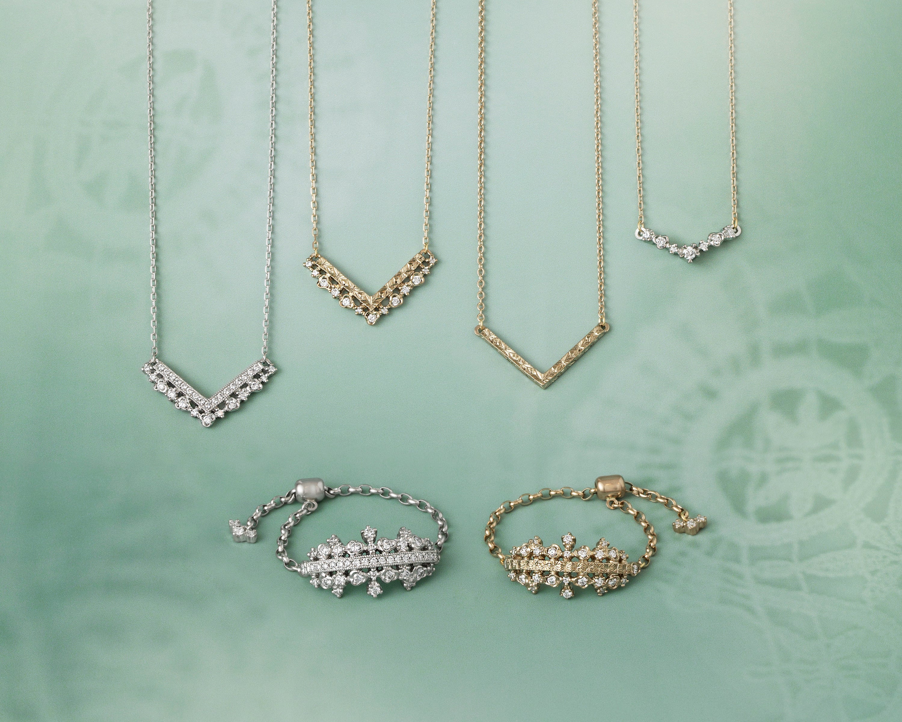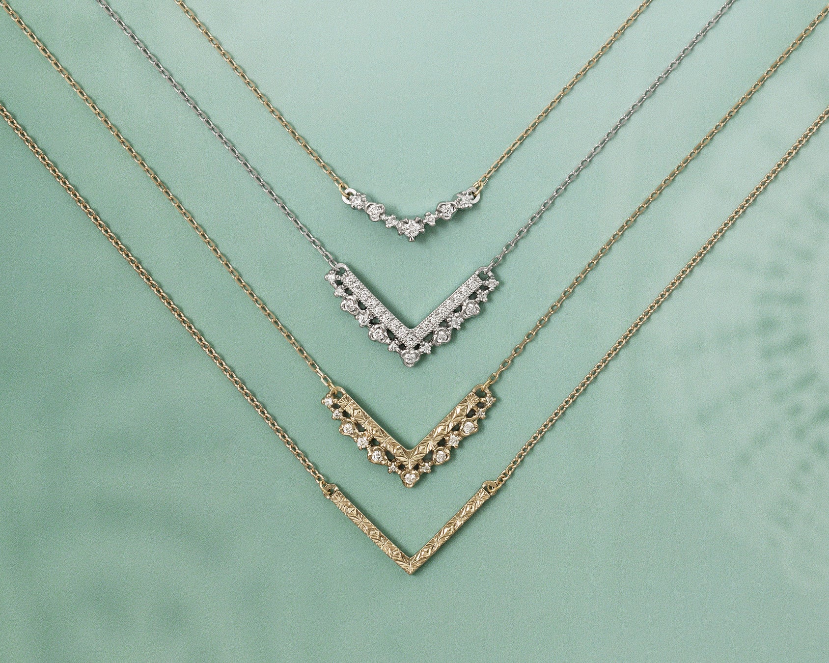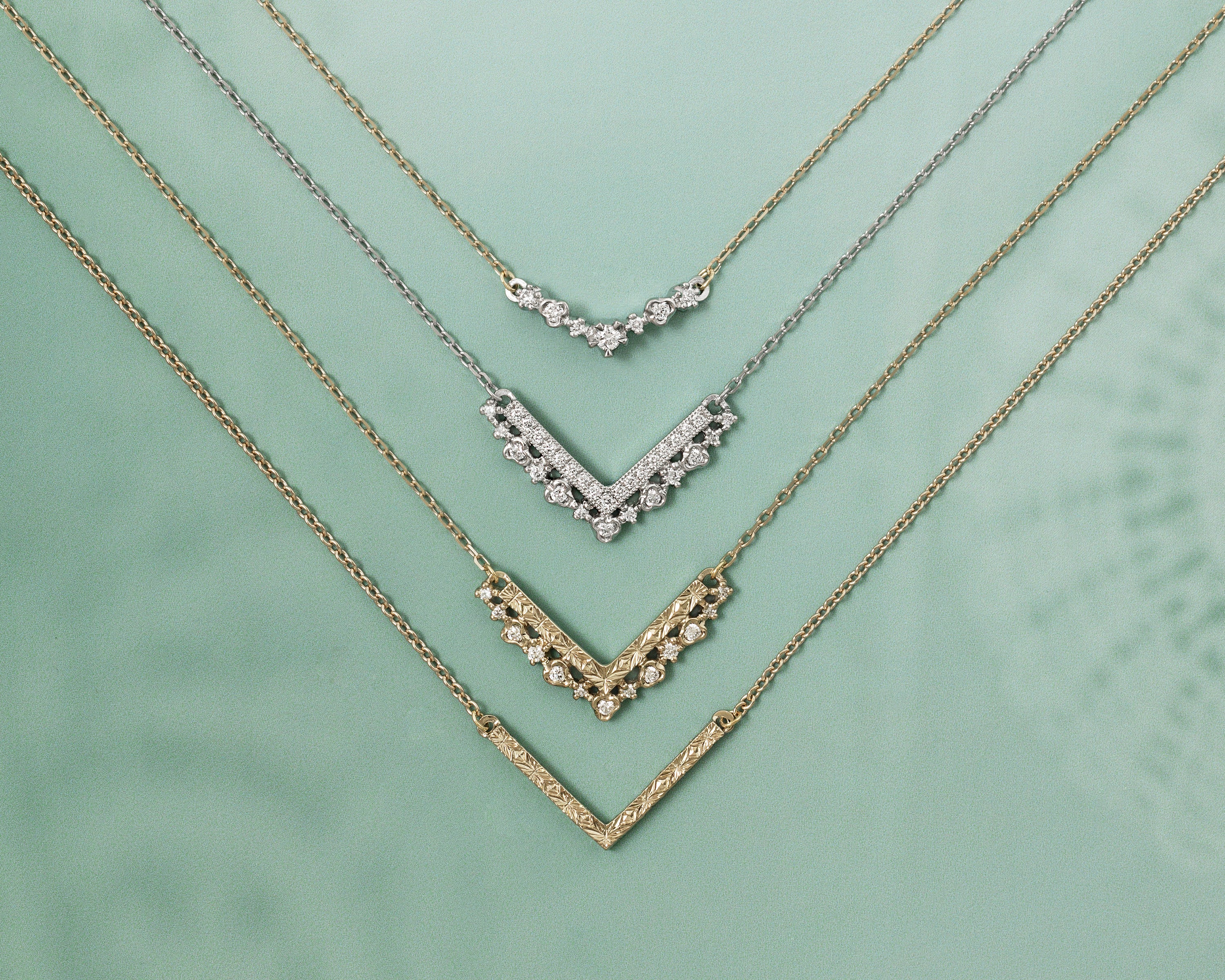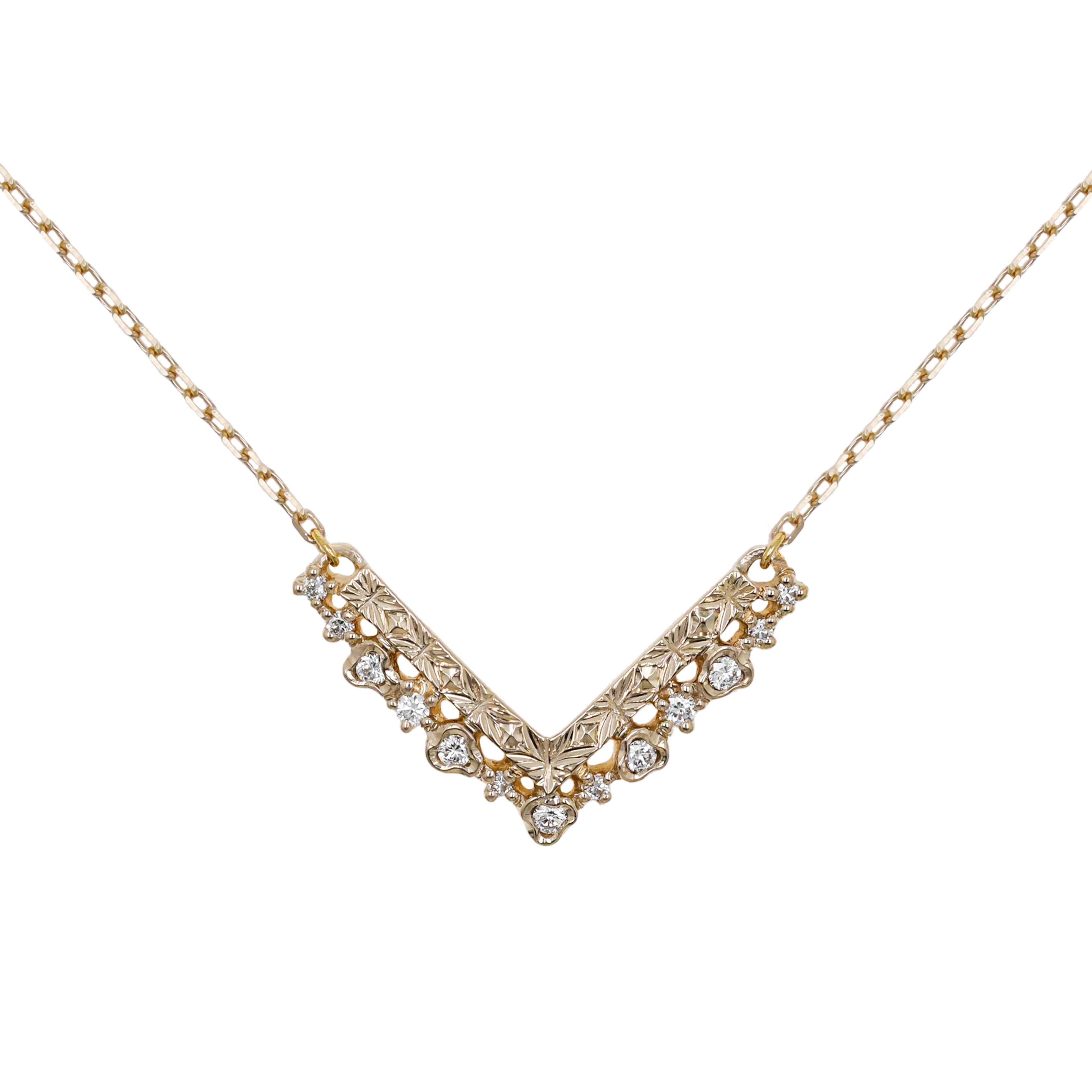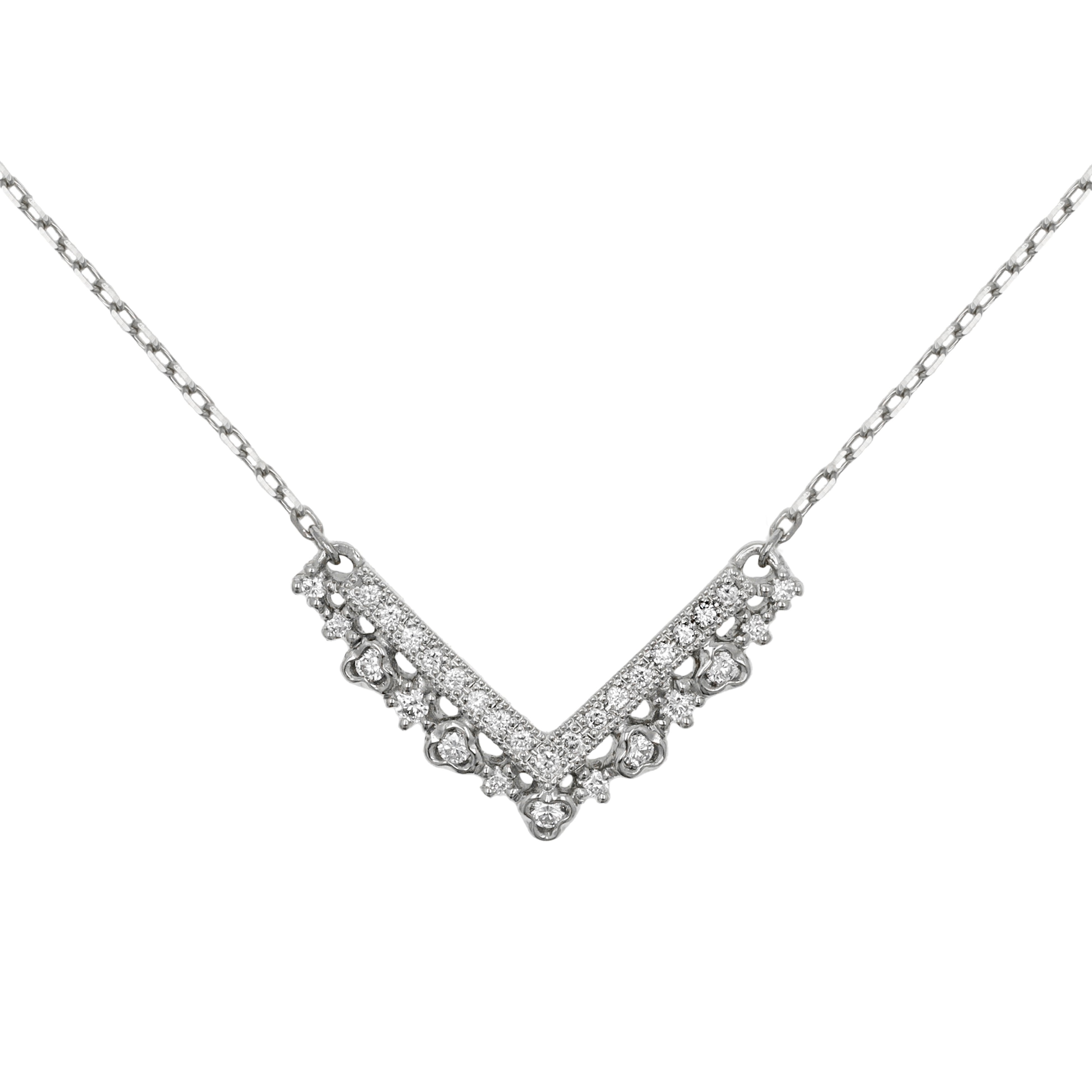 シャープなV字を描くラインに、金細工とダイヤモンドで紡がれた繊細なオープンワークの縁飾りを組み合わせたネックレス。直線的でモダンなV字に、ドレッシーなレースを想わせる透かしの装飾が調和しています。直線部分は、ダイヤモンドとミルグレインによって華やかに煌めくタイプと、熟練職人による彫模様で輝きを表現したタイプの2種類からお選びいただけます。