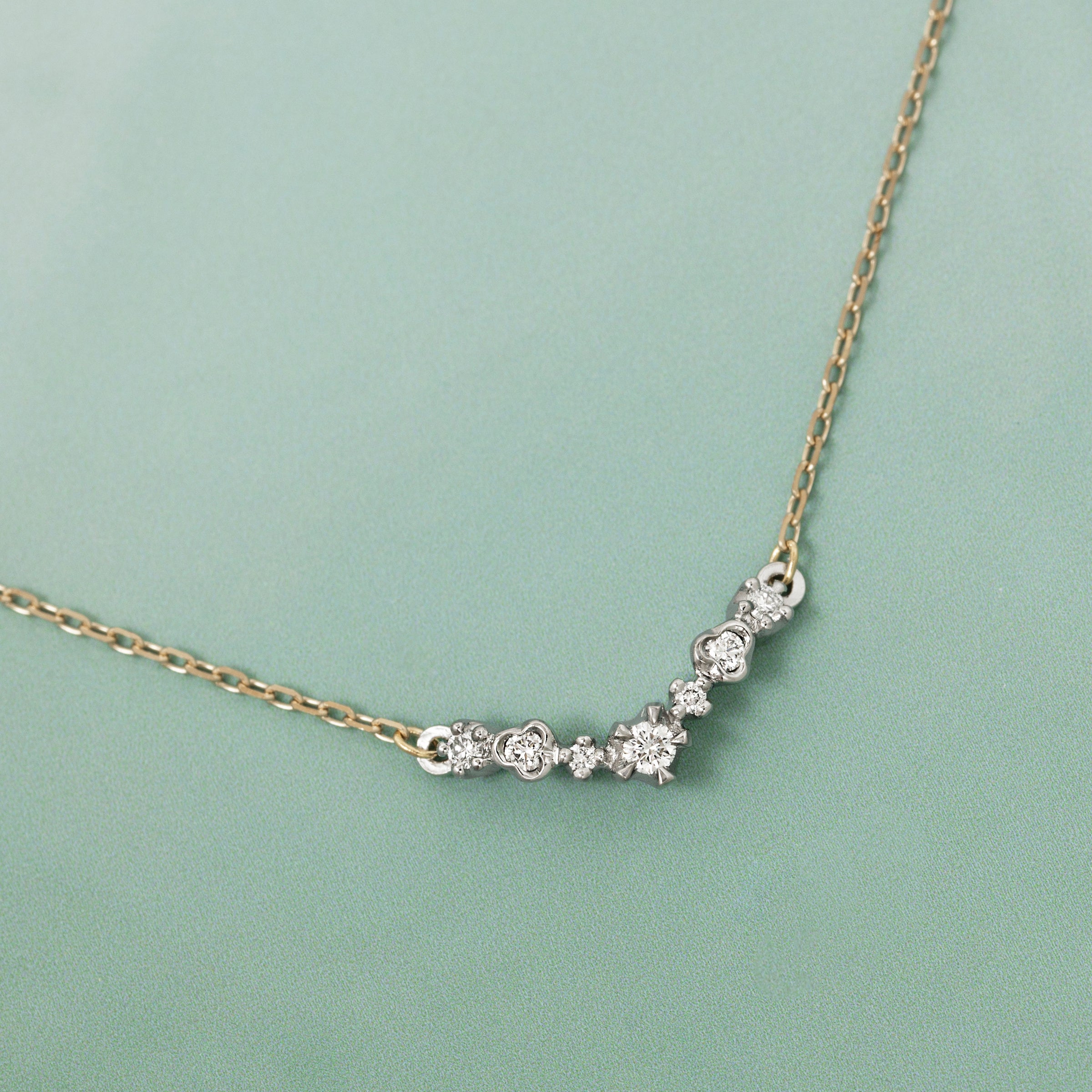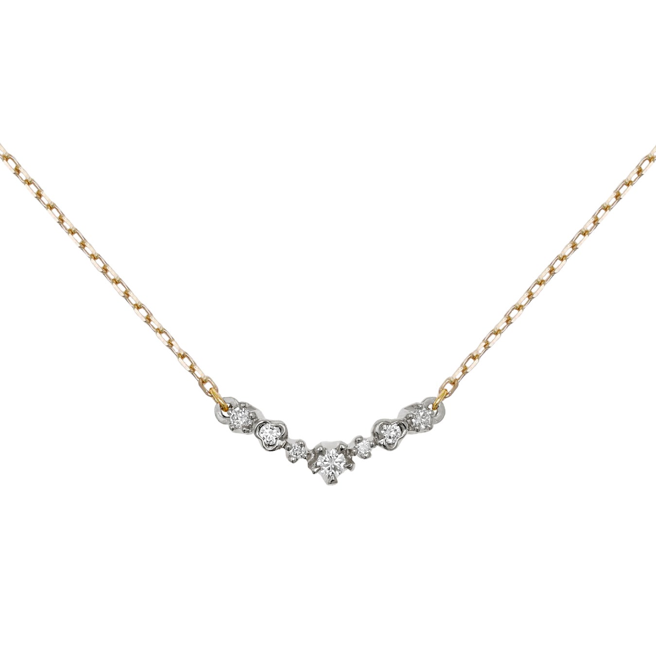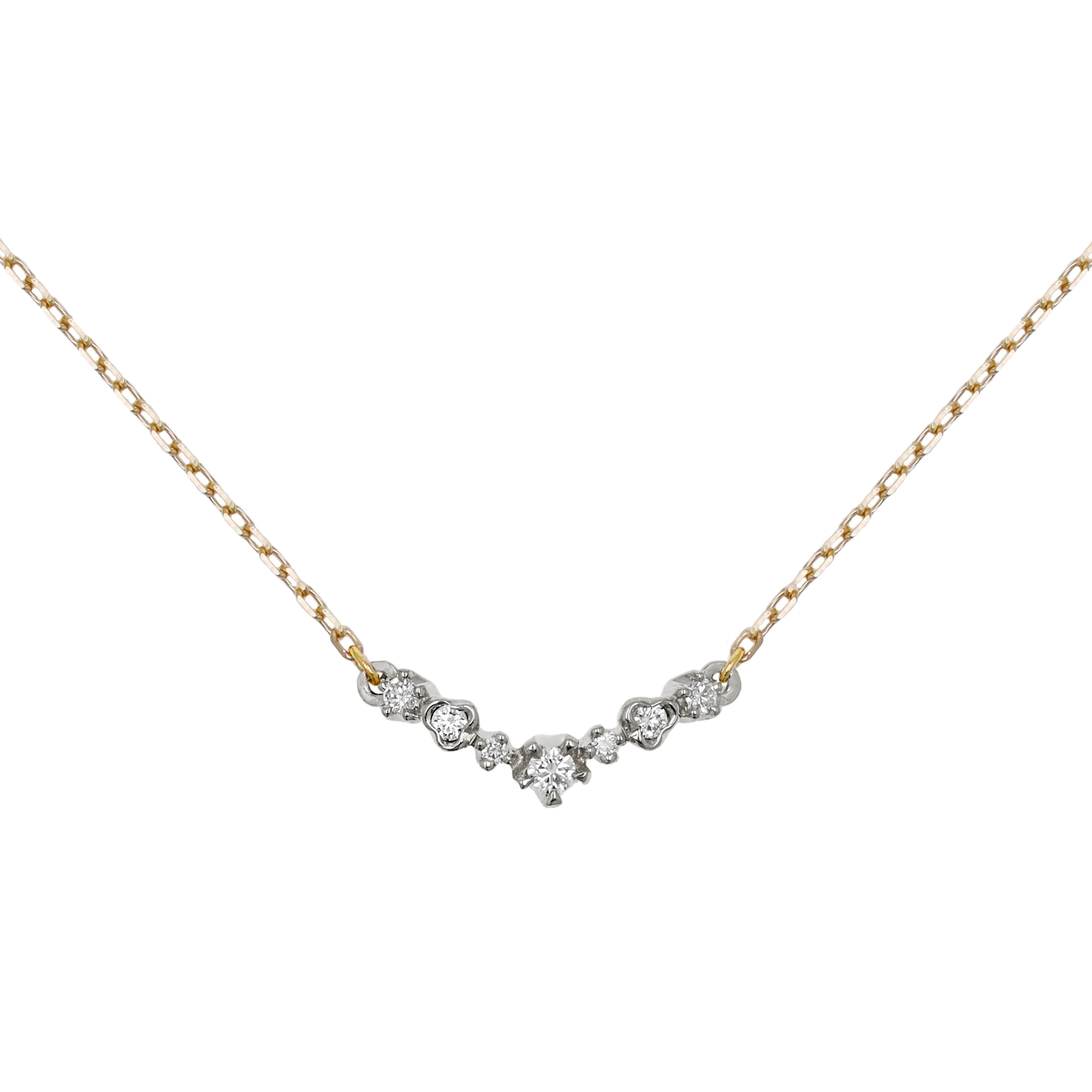 異なるさまざまな石座のダイヤモンドを寄せ集め、ゆるやかにV字ラインを描き出すデザインが特徴的なネックレス。複雑な陰影と奥行のある輝きに富み、デコルテに美しい立体感をもたらします。軽やかな着け心地を意識したデザインで、まるで素肌の一部のように、デイリーにお着けいただけます。