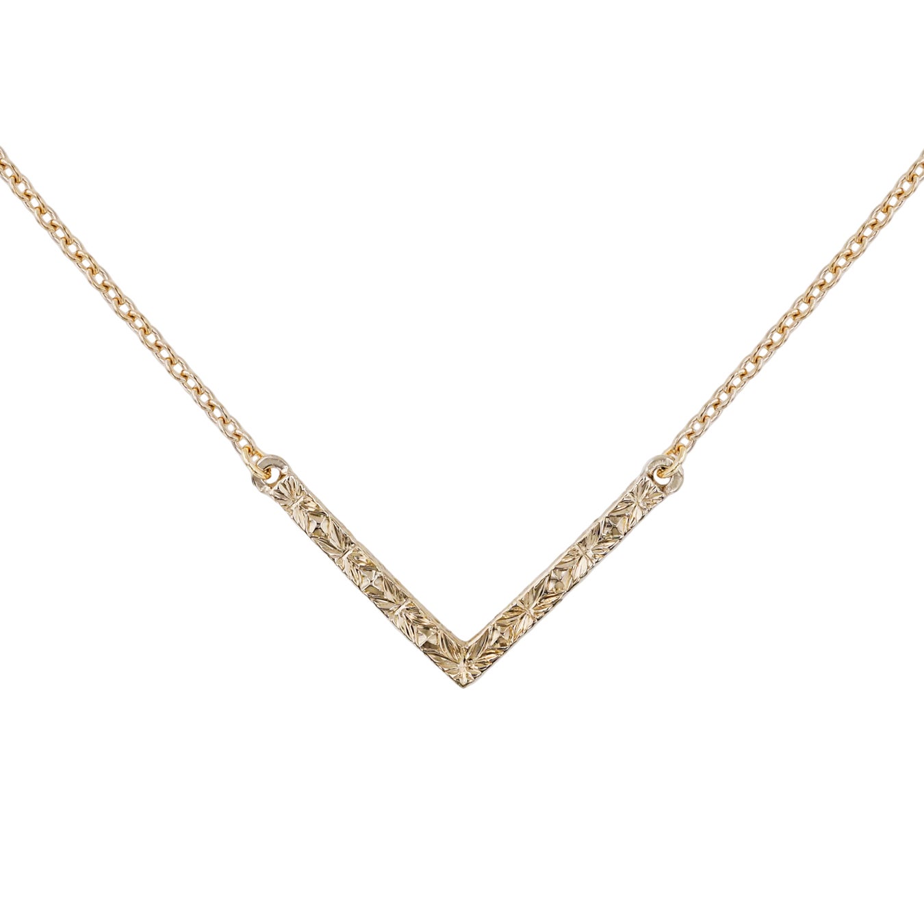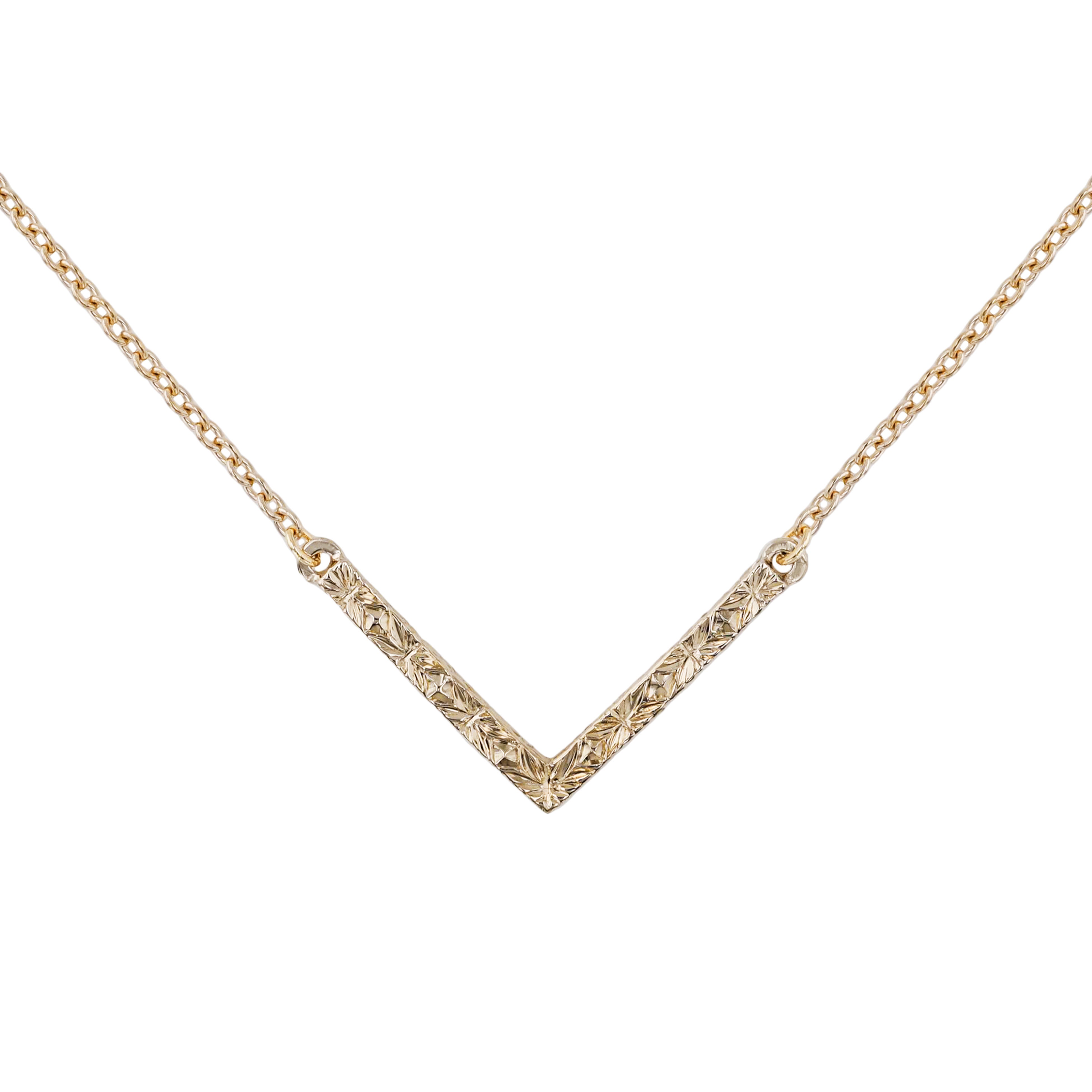 ミニマルなVシェイプのモチーフが、お首元を洗練された印象に見せてくれるネックレス。V字型のバーの3面に、輝きをイメージした彫模様が施され、金属本来のソリッドな光沢の中に、微細な光と影が生み出されます。チェーンの太さにもこだわり、モチーフとのバランスを考慮して、全体的な統一感があるように仕上げました。日常使いから特別なシーンまで幅広く活躍し、重ねづけのベースにもおすすめです。