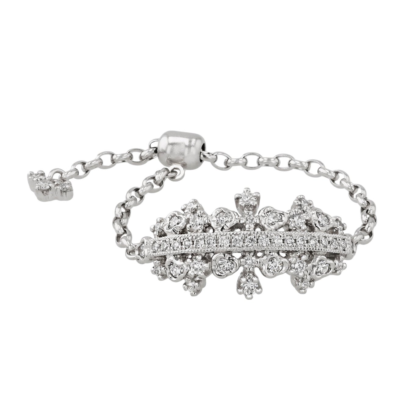 繊細なレースが指を包み込むようなフィット感を実現したチェーンリング。“reticella”のモチーフがトップ全面にあしらわれ、指元を華やかに見せてくれます。内側の仕様がチェーンのため、スリムな着け心地。サイドの干渉を抑えた設計で、ほかのリングとのコーディネートにも最適です。チェーンのエンドチャームには 3 石の小さなダイヤモンドが揺れ、細部にまでエレガントな美しさが光ります。