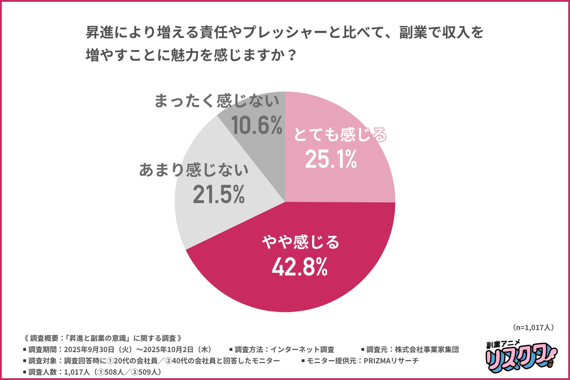 『副業アニメ リスクワ』を制作する、株式会社事業家集団(本社:東京都千代田区、代表取締役:田辺 由美子)は、①20代の会社員/②40代の会社員を対象に、「昇進と副業の意識」に関する調査を行いました。