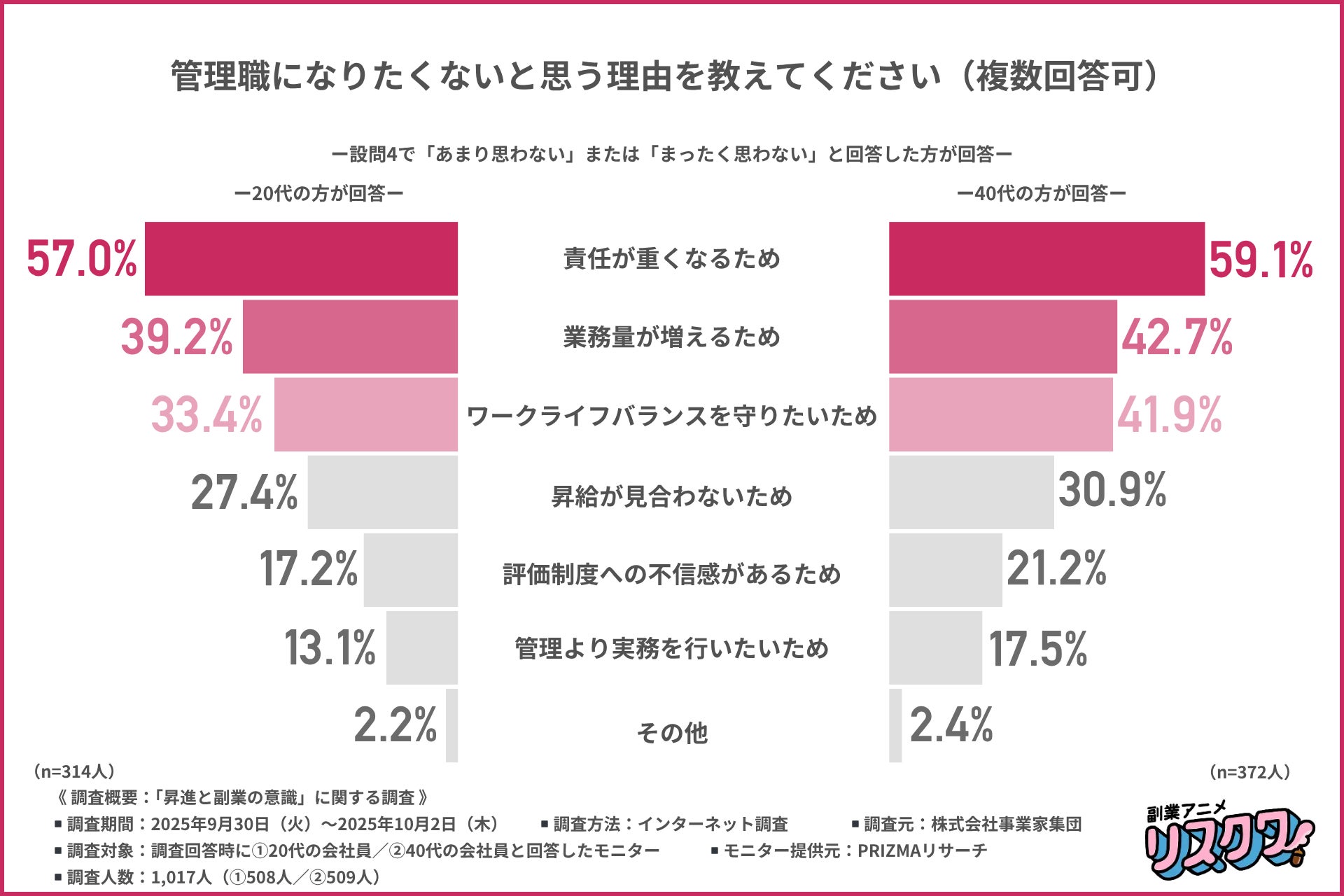 そこで、『副業アニメ リスクワ』(https://www.riskwa.jp/)を制作する株式会社事業家集団は、①20代の会社員/②40代の会社員を対象に、「昇進と副業の意識」に関する調査を行いました。