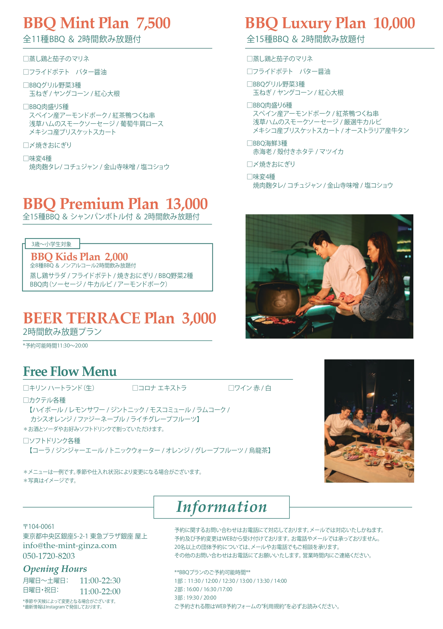 🍺「The Mint Ginza」営業時間 ※季節や雨天により変更となる可能性がございます。