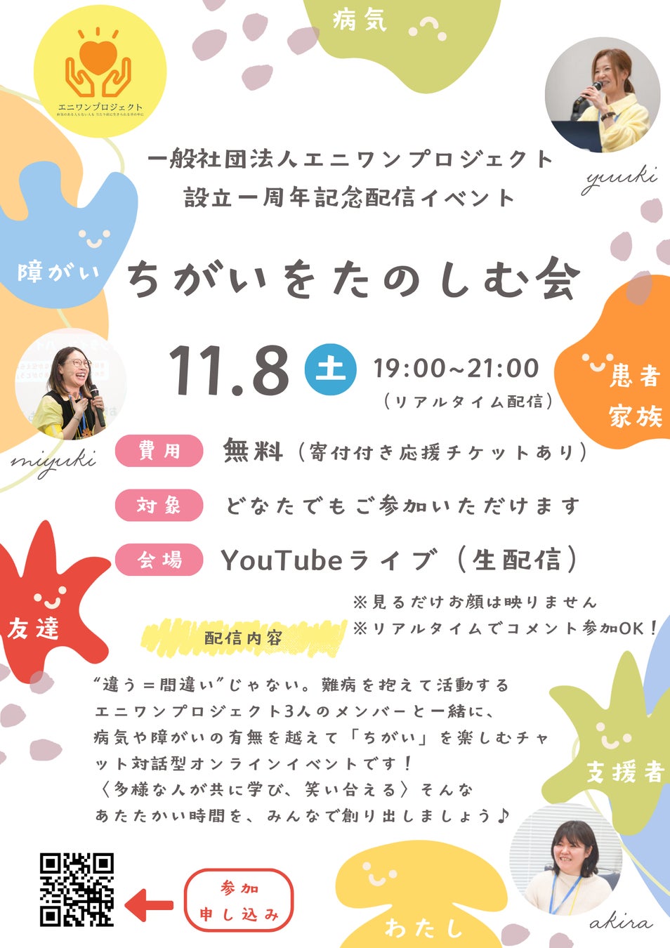 病気や障がいがあってもなくても、1人1人の違いを知ることは共に生きやすい社会をつくる第一歩。エニワンプロジェクト理事3名(難病当事者)が語り合うオンラインイベントをYouTubeライブで開催します。