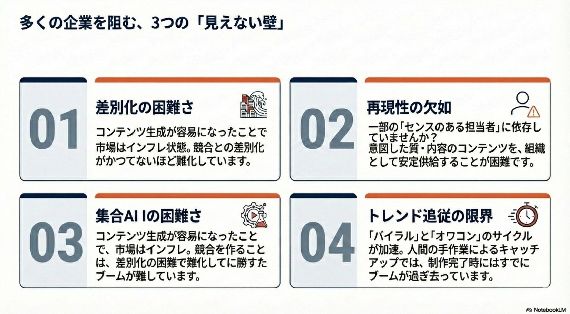 「AIによって誰もが発信者になれる時代、情報の価値は相対的に低下しています。企業が直面しているのは、『作れるが、勝てない』という新たな壁です。
