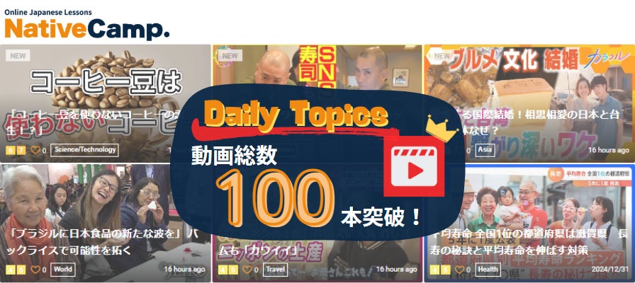 株式会社ネイティブキャンプ(本社:東京都渋谷区、代表取締役社長:谷川国洋)が提供するオンライン日本語会話サービス『Native Camp Japanese』は、このたび日本語学習教材「デイリートピック」の動画総数が100本を突破しましたことをお知らせいたします。