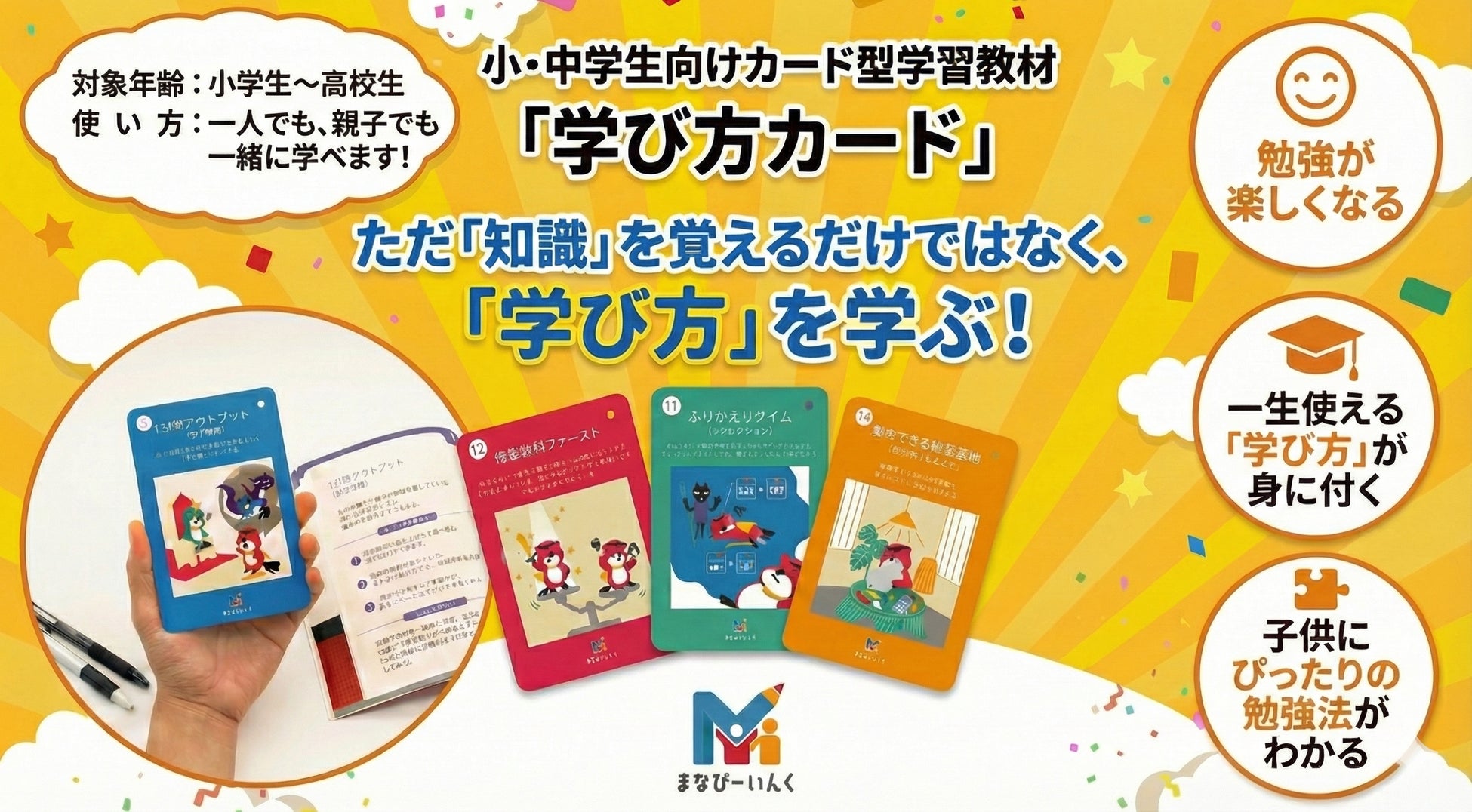 教育事業を展開する株式会社まなびーいんぐが「学び方カード」を販売開始いたしました。本製品は、「子どもが自分に合った学び方(学習方略)を知らない」という課題に対し、科学に基づいた学び方を提示するオリジナル教材です。ご家庭での自立学習のサポートはもちろん、学校や塾の教員が日々の指導で活用することもできます。
