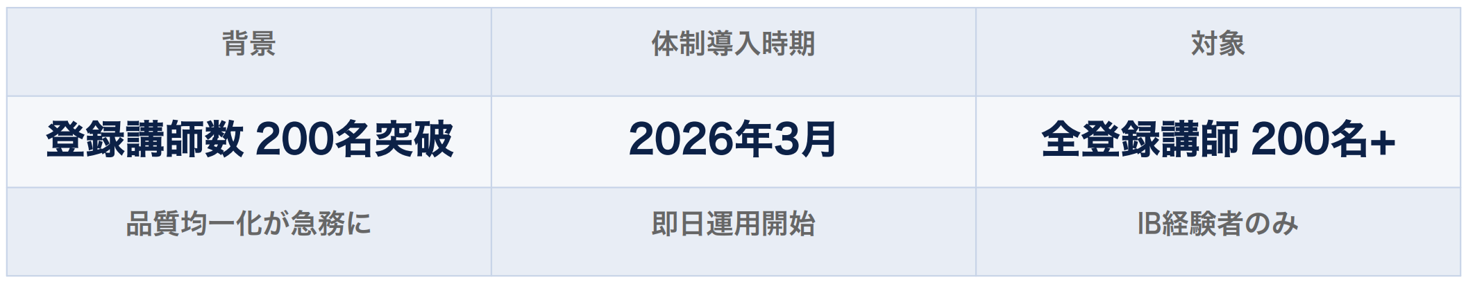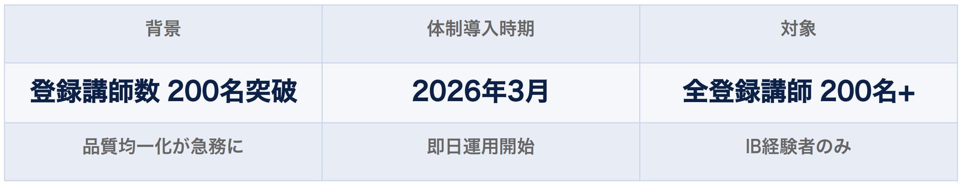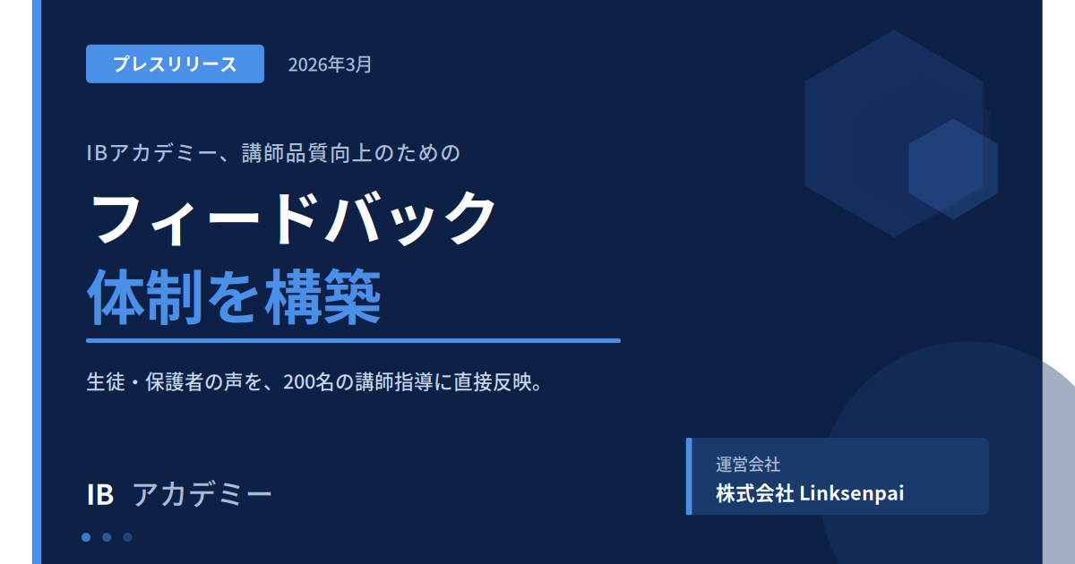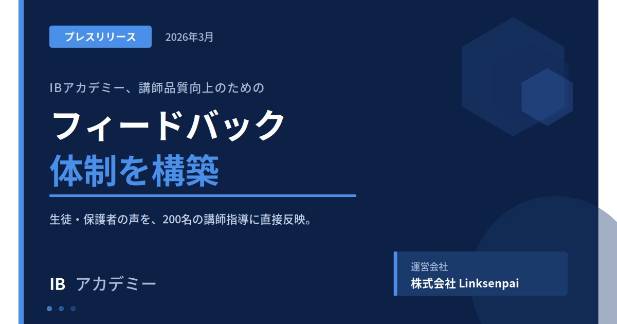 株式会社Linksenpai(所在地:東京都渋谷区、代表取締役:吉田志織)が運営するIB(国際バカロレア)専門オンライン家庭教師サービス「IBアカデミー」は、2026年3月、生徒・保護者からのフィードバックを講師に直接届ける専用体制を導入しました。登録講師数が200名を超えた現在、講師全員が均一に高品質な指導を提供できる環境づくりの一環として実施します。