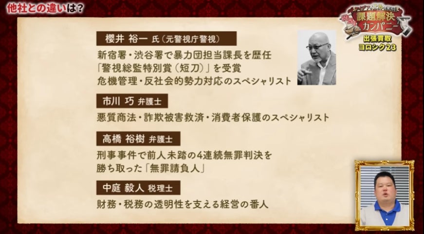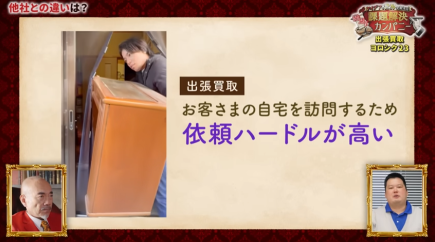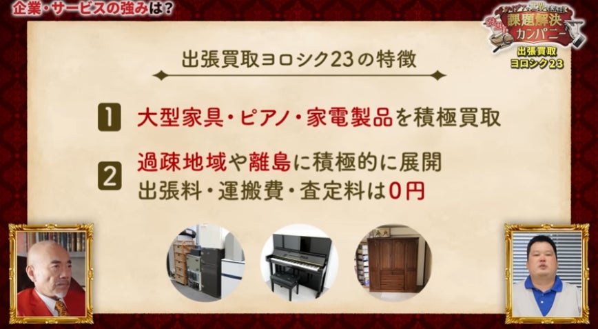 出張買取サービスを展開する株式会社マンクンカンクン(旧:新日本リサイクル評議会)は、俳優 竹中直人 が主催する経済番組「課題解決カンパニー」に出演し、同社の出張買取サービス 「出張買取ヨロシク23(ヨロシクニイサン)」 が、社会課題解決型ビジネスとして紹介されました。