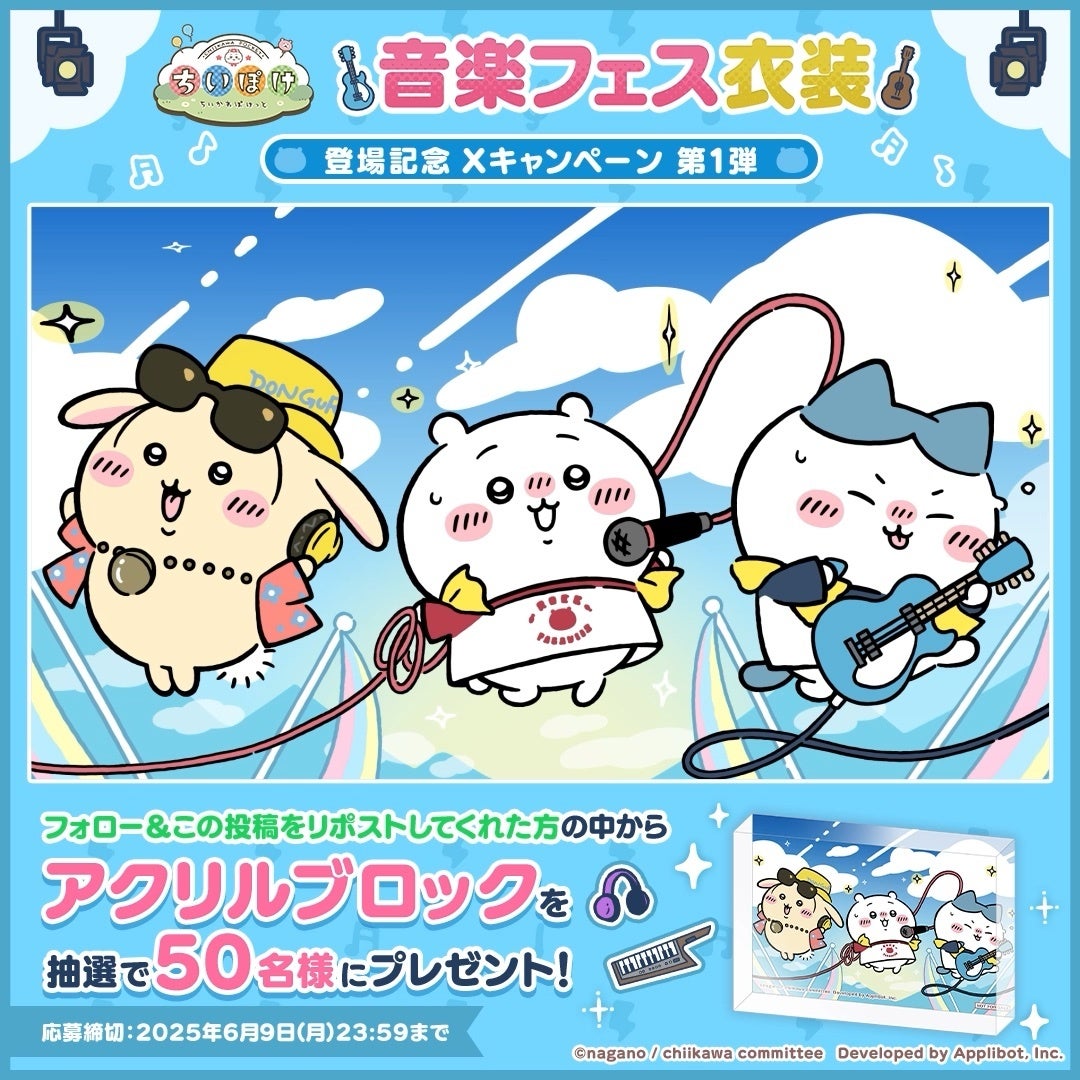 株式会社アプリボット(本社:東京都渋谷区、代表取締役社長:浮田光樹)が企画・制作・開発・運営を行う、スマホアプリ『ちいかわぽけっと』(以下、『ちいぽけ』)は、新テーマ・音楽フェスのイベントを本日6月3日(火)より開催いたします。また、イベントの開催に合わせ、公式Xにてプレゼントキャンペーンも実施いたします。